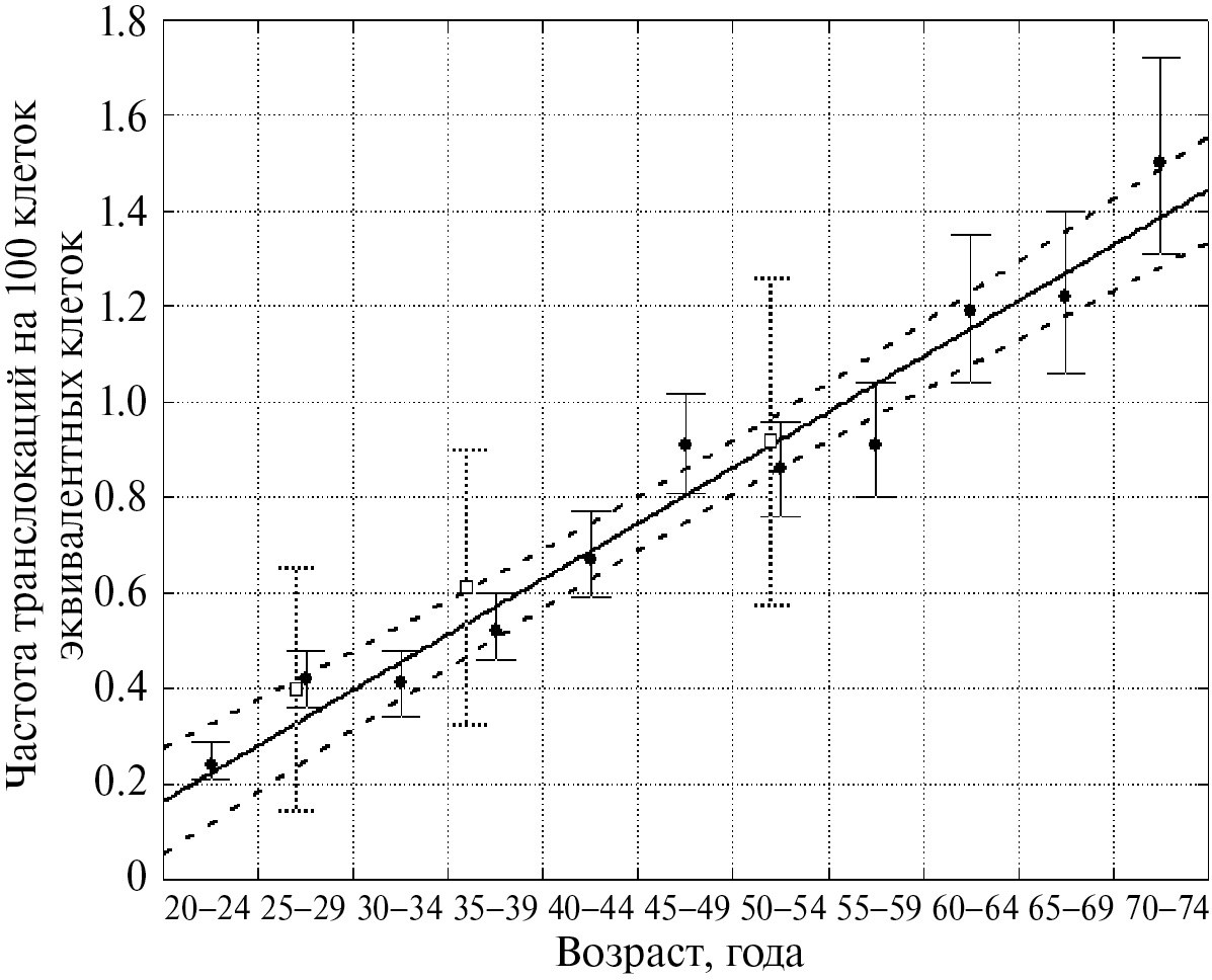 Fig. 2. Dependences of translocation frequencies per 100 genome-equivalent cells on age. The data taken from the article [18] are highlighted by shaded circles and solid lines: averages with 95% confidence intervals for 5 years and a linear regression constructed for them (the 95% confidence zone of the regression is indicated by a dotted line). Squares and pointed lines indicate averages with 95% confidence intervals obtained in this work (see text).