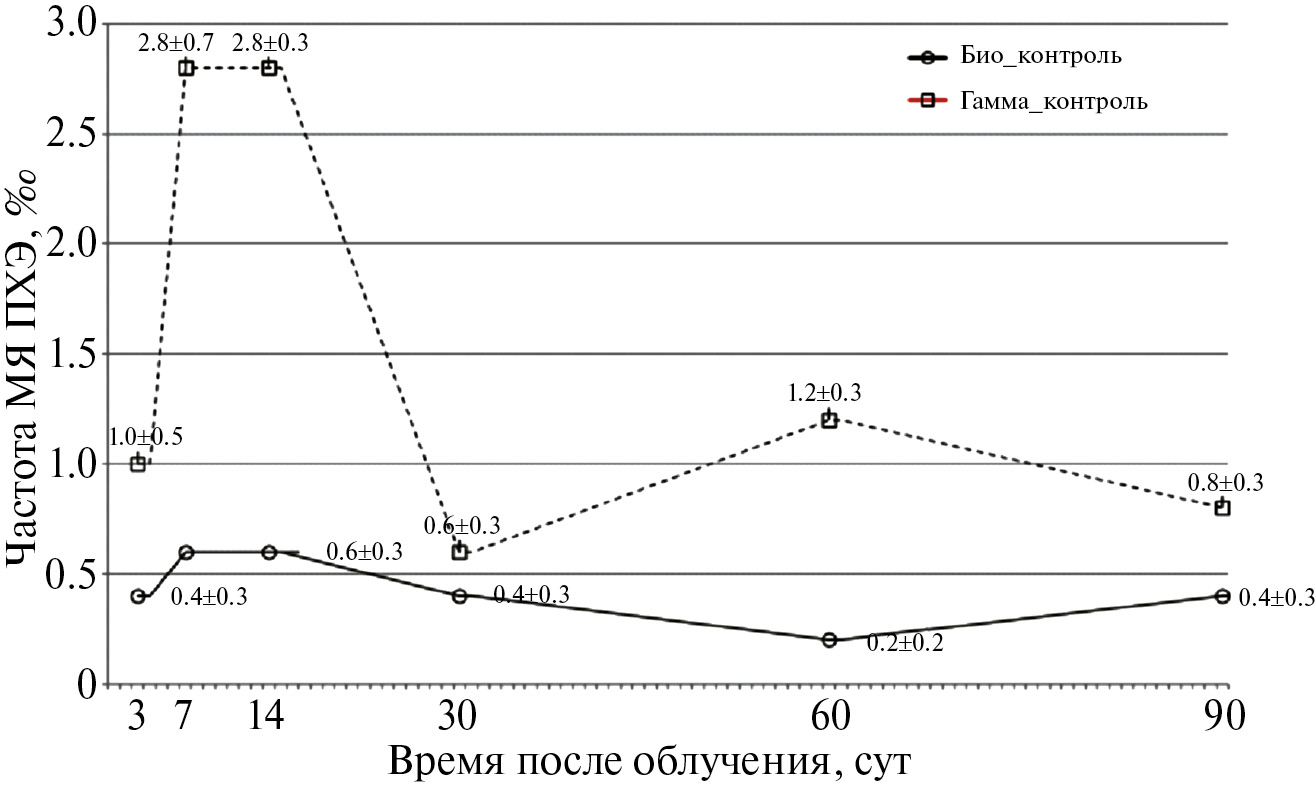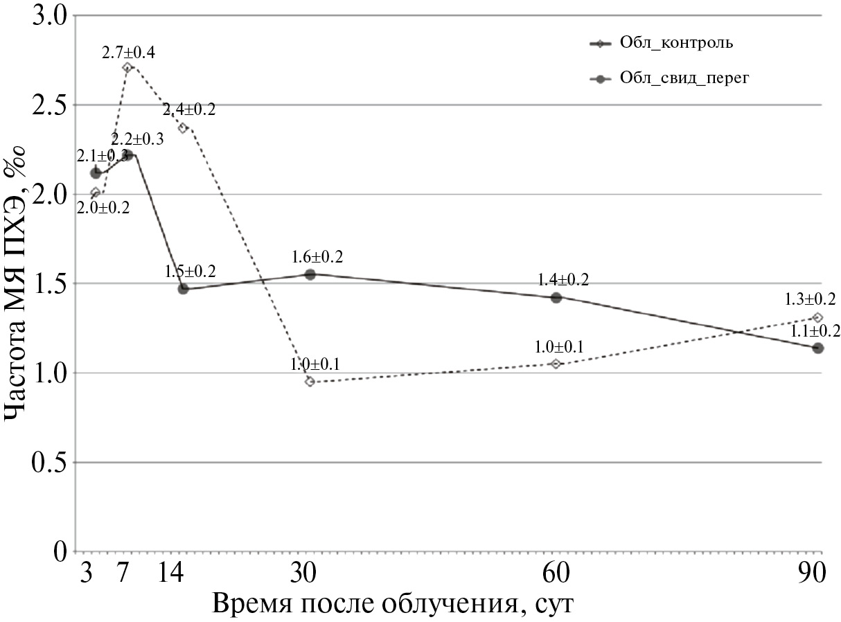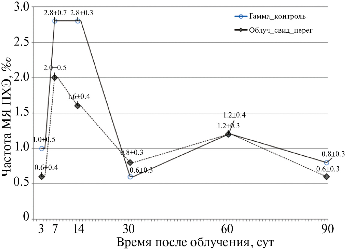 В группе биологического контроля средняя частота ПХЭ с микроядрами в периферической крови мышей составляла 0.2–0.6 ‰. Начиная с 7-х суток после воздействия γ-излучения у животных происходило статистически значимое (t = 2.95; p = 0.01) увеличение частоты ПХЭ с микроядрами, когда этот показатель превышал значение в группе биологического контроля почти в 5 раз. Такой высокий уровень цитогенетических повреждений сохранялся до 14 суток, а далее происходило снижение частоты рассматриваемых хромосомных нарушений (рис. 1).