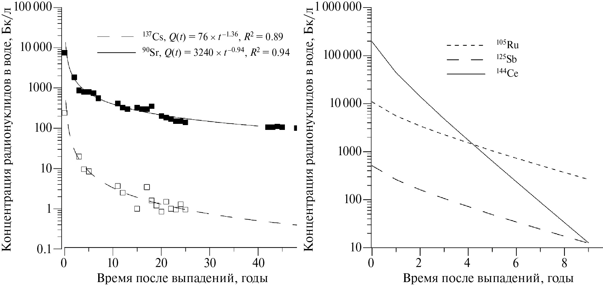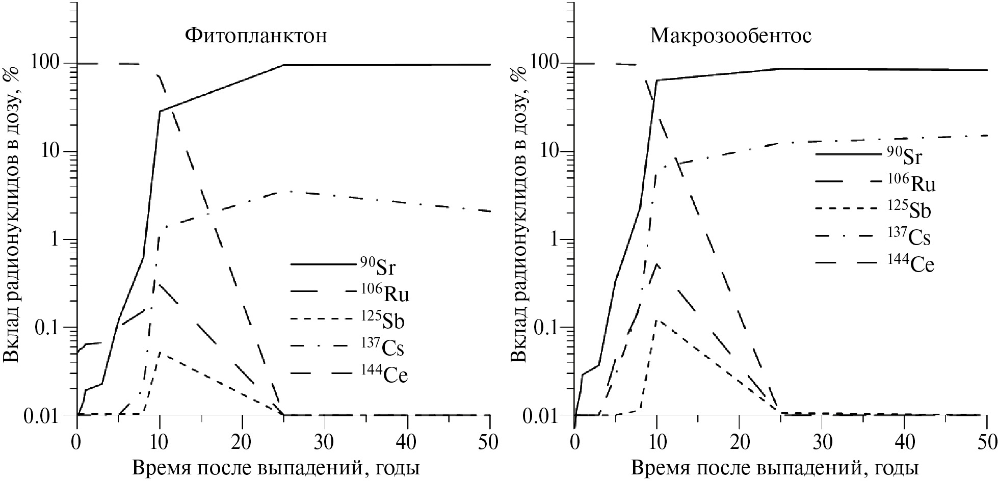 Общей тенденцией является то, что вклад доз, формируемых 144Ce, преобладает в течение первых 7–8 лет после загрязнения водоема. В период с 8-го по 15-й годы вклад 144Ce в дозу снижается и наблюдается рост вклада 90Sr, достигая паритета с вкладом 144Ce к 10–15-му году после выпадений. Вклад 106Ru и 125Sb составлял, за исключением рыбы, менее процента.