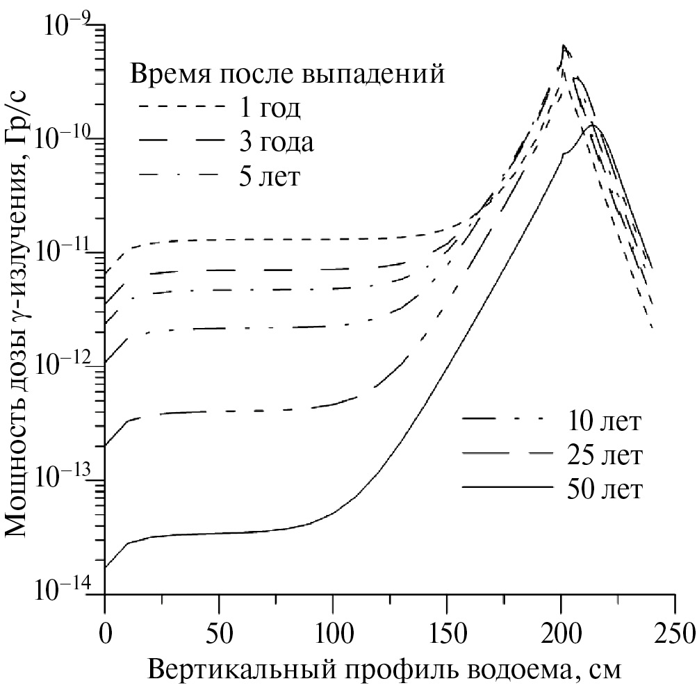 Для расчета мощности дозы в зоне 3, на основе данных о вертикальном профиле распределения радионуклидов, донные отложения были разбиты на слои и мощность дозы рассчитывалась, как суперпозиция доз от таких слоев с учетом ослабления мощности дозы от вышележащих слоев и вклада дозы от радионуклидов, содержащихся в воде.