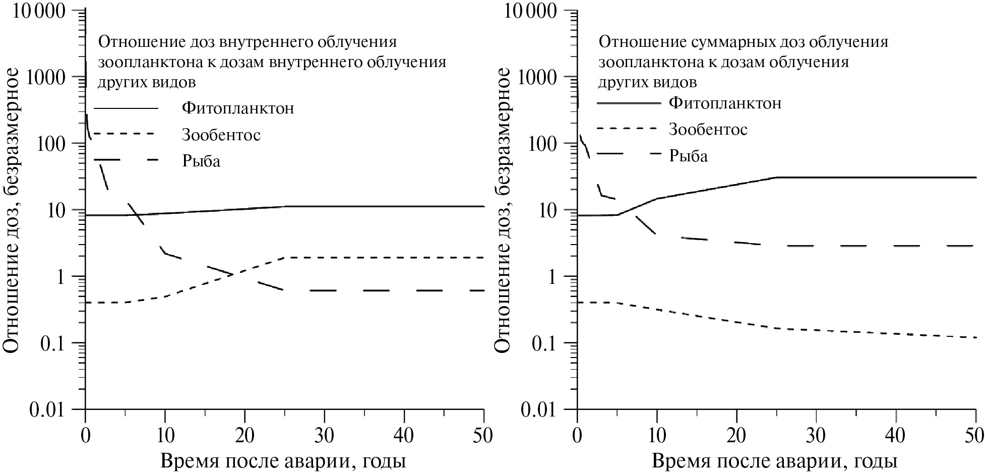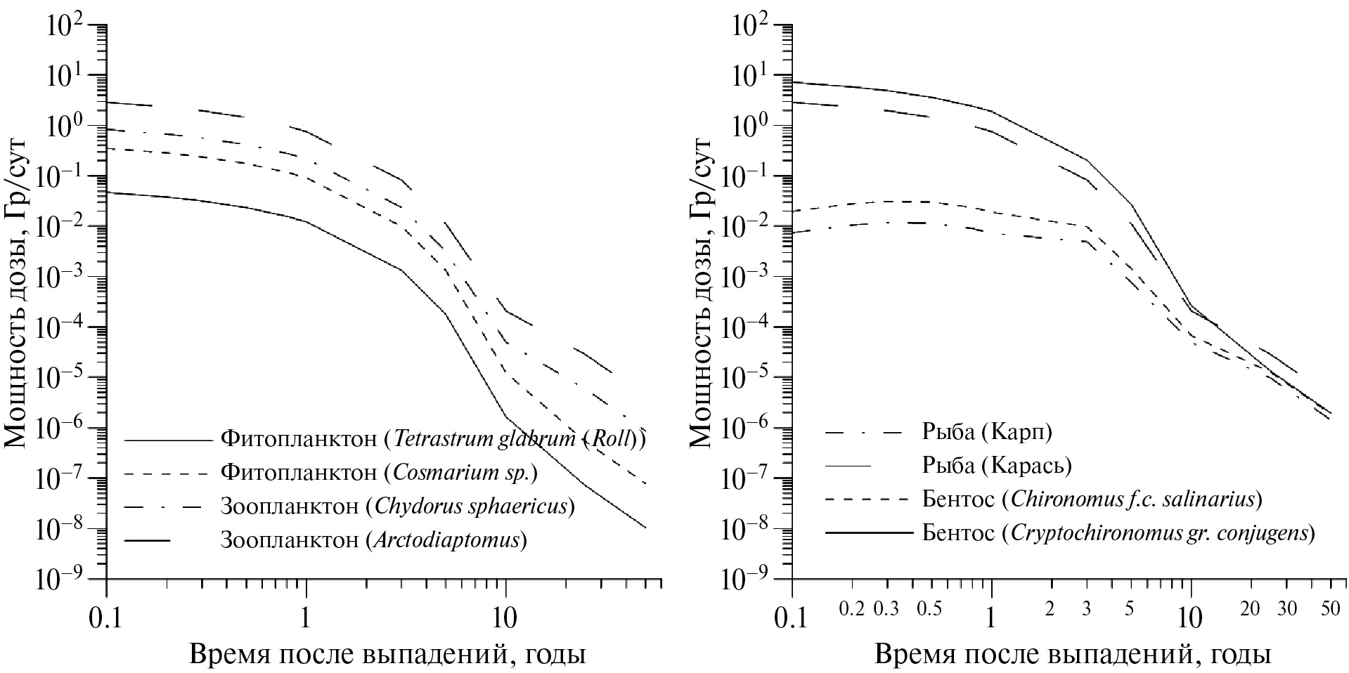 В первый период после загрязнения водоема максимальные дозы облучения (2.6–8.3 Гр/сут) отмечались для бентосных организмов, несколько меньшие дозы (до 3.3 Гр/сут) были характерны для зоопланктона. Минимальные дозы на протяжении первых 100 дней после загрязнения (до 4 мГр/сут) получали рыбы. Фитопланктон (дозы до 0.5 Гр/сут) в этом ряду занимает промежуточное положение. Дозы облучения рыбы достигают максимума (14–31 мГр/сут) через 100–150 дней после выпадений, снижаясь до 8.1–20 мГр/сут к одному году после загрязнения водоема. На протяжении 50 лет после загрязнения водоема дозы облучения гидробионтов снизились от шести порядков величины (фито и зоопланктон) до примерно 100 раз (бентосоядная рыба), отражая особенности обитания организмов в водоеме. В последующем (примерно через 10 лет после загрязнения водоема) дозы облучения рыбы стали достаточно близки к уровням облучения зообентоса и зоопланктона.