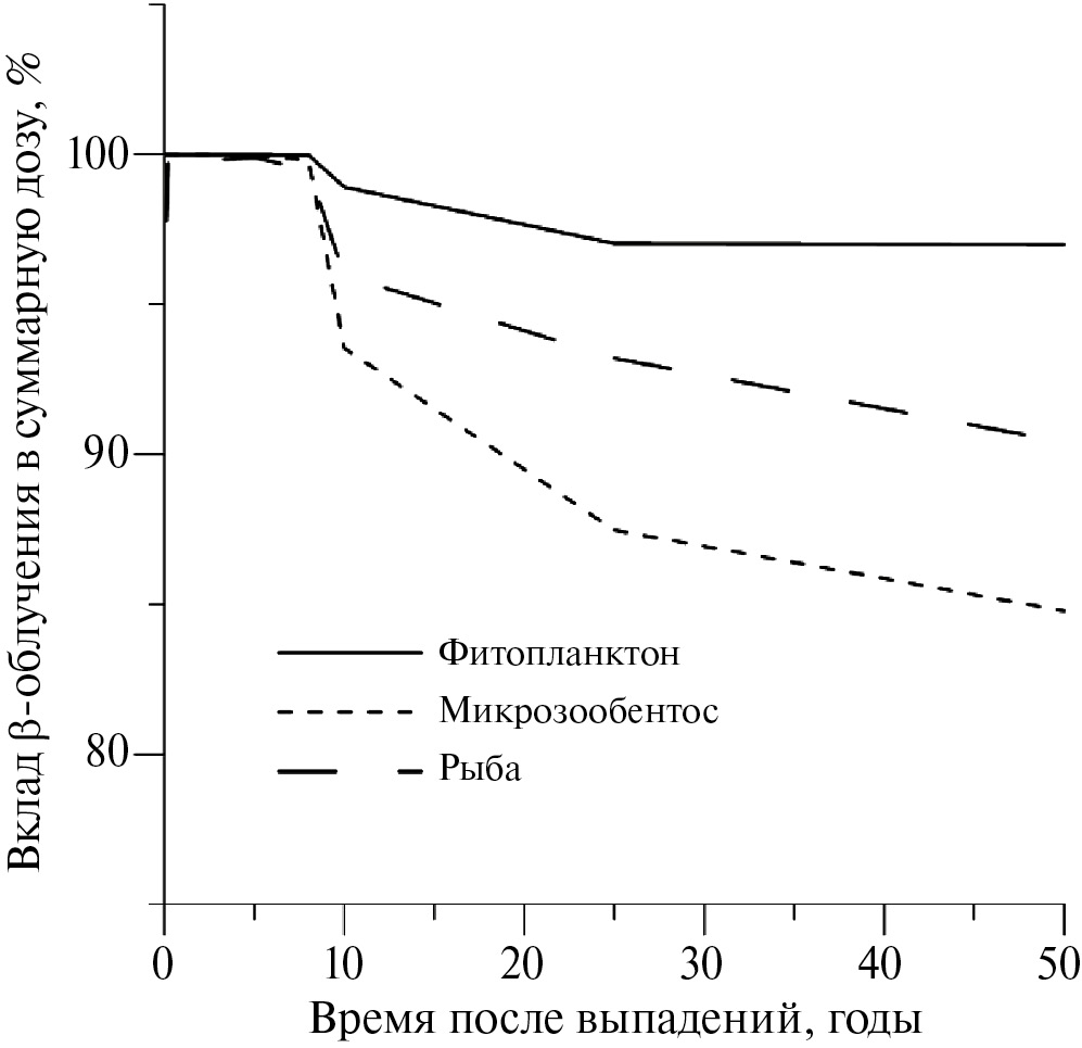 В последующем вклад β-излучения снижается, причем динамика этого снижения определяется экологической нишей, занимаемой группой организмов. В наибольшей степени это выражено для донных организмов, что связано с различной проникающей способностью β- и γ-излучения, так как перераспределение радионуклидов в донных отложениях и вынос их из слоя, в котором обитает макрозообентос, в большей степени сказывается на дозах β-излучения. Этот эффект, хотя и в меньшей степени, сказывается на дозах облучения придонных видов рыбы, и практически на сказывается на дозах облучения организмов, обитающих в верхних слоях воды – фитопланктоне, зоопланктоне и некоторых видах рыб.