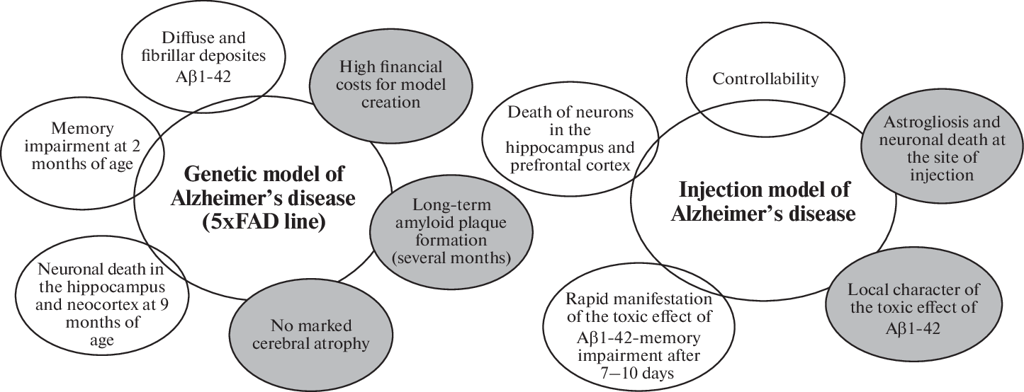 Alzheimer’s disease is the most common type of dementia associated with cognitive decline, such as memory and visuospatial skills. Insufficiently effective treatments have prompted the creation of experimental animal models capable of reproducing the pathology of Alzheimer’s disease, especially at the presymptomatic stage, in order to develop and study preventive and therapeutic strategies. To date, none of the developed animal models fully reflects the entire spectrum of neuropathological and cognitive impairments observed in the development of Alzheimer’s disease in humans. However, each model created allows, to one degree or another, to study various aspects of the pathogenesis of the disease, providing an important understanding of the key pathological changes that may occur during its development. In this review, we present a summary of the neuropathological features of Alzheimer’s disease and their relationship to cognitive impairment in the animal models currently in use. We also present in a comparative aspect the features of the development of Alzheimer’s type neurodegeneration using the example of 2 models – genetic and injection, which will make it possible to determine optimal approach when choosing a model for implementing research tasks.