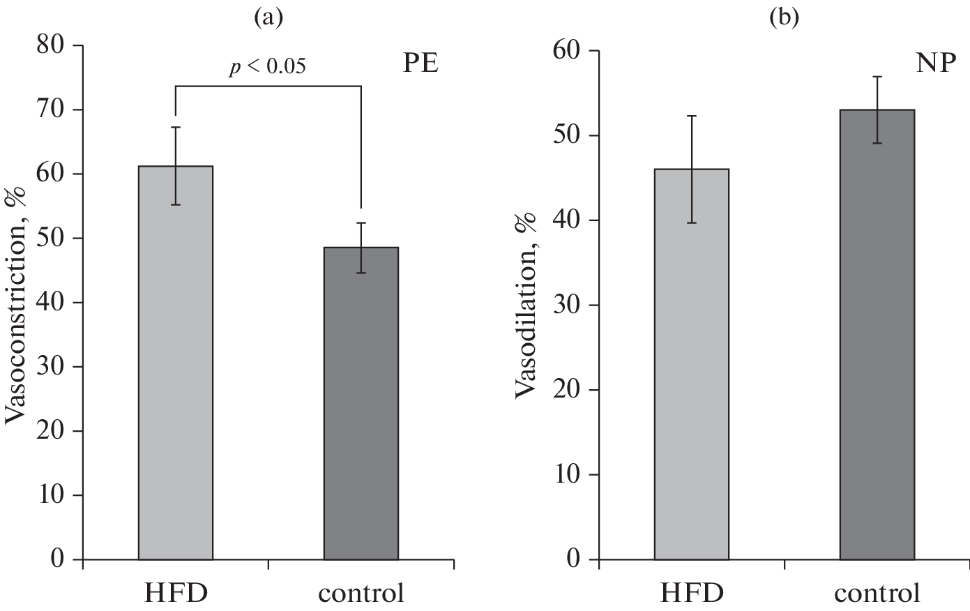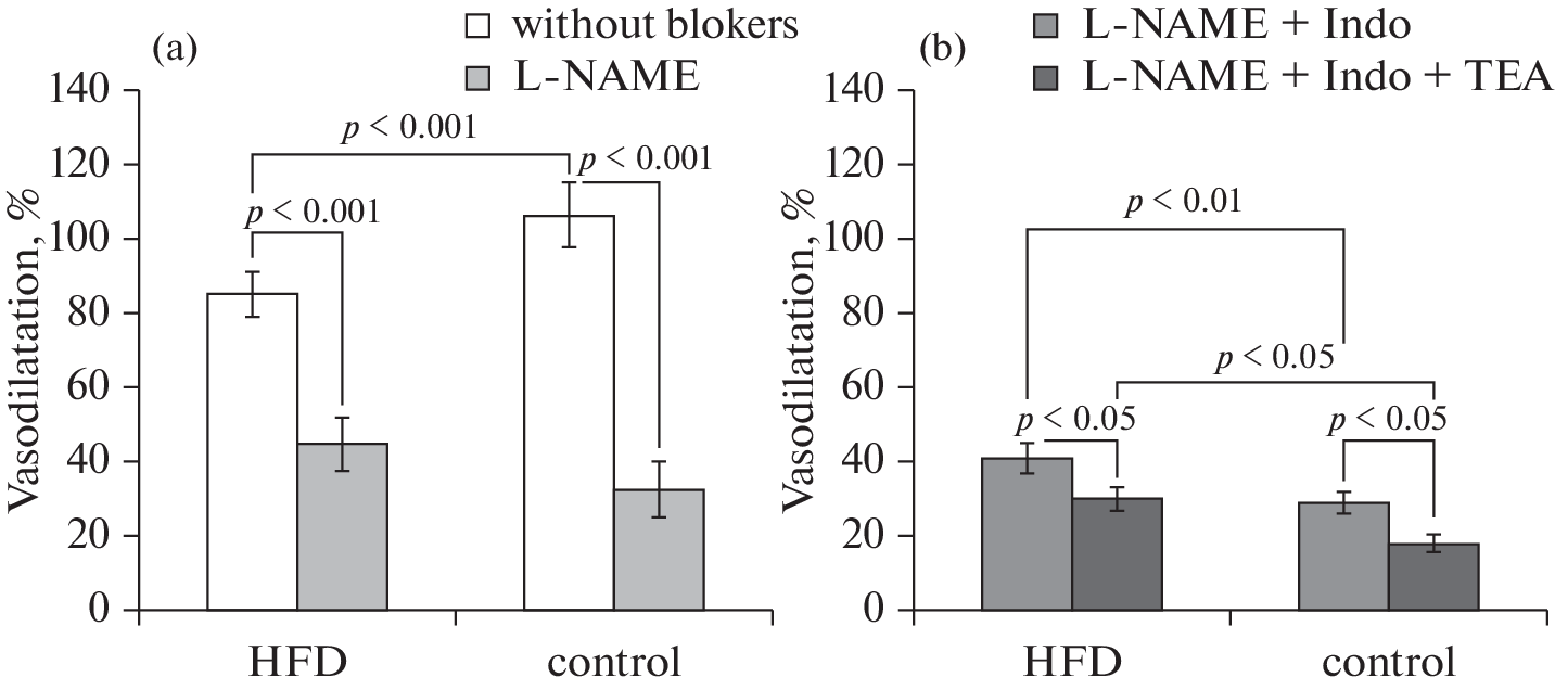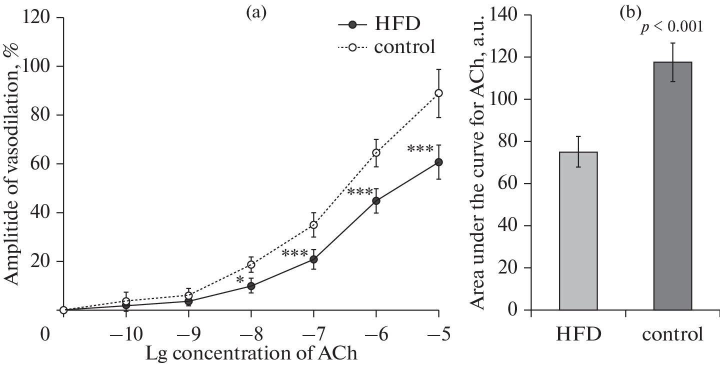 Higt fat diet can lead to the development of metabolic syndrome (MS). However, the question of the mechanisms of pathophysiological processes in MS has not been studied enough. The aim of the work was to study the effect of a high-fat diet (HFD) on the reactivity of the mesenteric arteries of Wistar rats in vivo, as well as to evaluate the change in the mechanisms of endothelium-dependent arterial dilatation in HFD. The HFD-group of rats (n = 25) received HFD containing 50% animal fat for 10 weeks, the control group (n = 25) received a standard diet. The effect of HFD on endothelium-dependent and endothelium-independent responses of the mesenteric arteries under the action of agonists in the absence and with the use of blockers of NO-synthase (L-NAME), cyclooxygenase (indomethacin), and K+-channels (tetraethylammonium) was assessed using photomicrography and video recording of mesenteric artery diameter in vivo. HFD in rats led to the development of MS, including dyslipidemia, hyperglycemia and insulin resistance, and an increase in blood pressure. MS was accompanied by impaired functional state of the mesenteric arteries. In rats of the HFD group, compared with the control group, there was an increase in the constrictor reaction to phenylephrine by 29%, as well as a decrease in the reactivity of vessels previously contracted by phenylephrine under the action of acetylcholine by 36%. Pre-incubation of vessels with blockers reduced the amplitude of relaxation under the action of acetylcholine, compared with the initial acetylcholine-induced vasorelaxation, in HFD-group rats: with L-NAME – by 47%, L-NAME and indomethacin – by 50%, L-NAME, indomethacin and tetraethylammonium – by 65%; in the control group – by 69, 72 and 83%, respectively. HFD had no significant effect on the amplitude of vasodilation under the action of sodium nitroprusside. Thus, endothelial dysfunction in HFD-treated rats was mediated both by impairment of NO-dependent mechanisms of vasodilation, in particular, by a decrease in NO production by the endothelium, and by a decrease in the effectiveness of ВКСа. The decrease in NO bioavailability in HFD was partially compensated by the activation of endothelial hyperpolarization mechanisms (mediated by IKCa and SKCa activities) in acetylcholine-induced vasodilation.