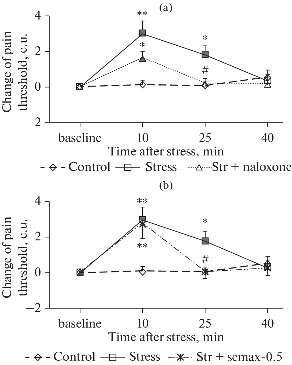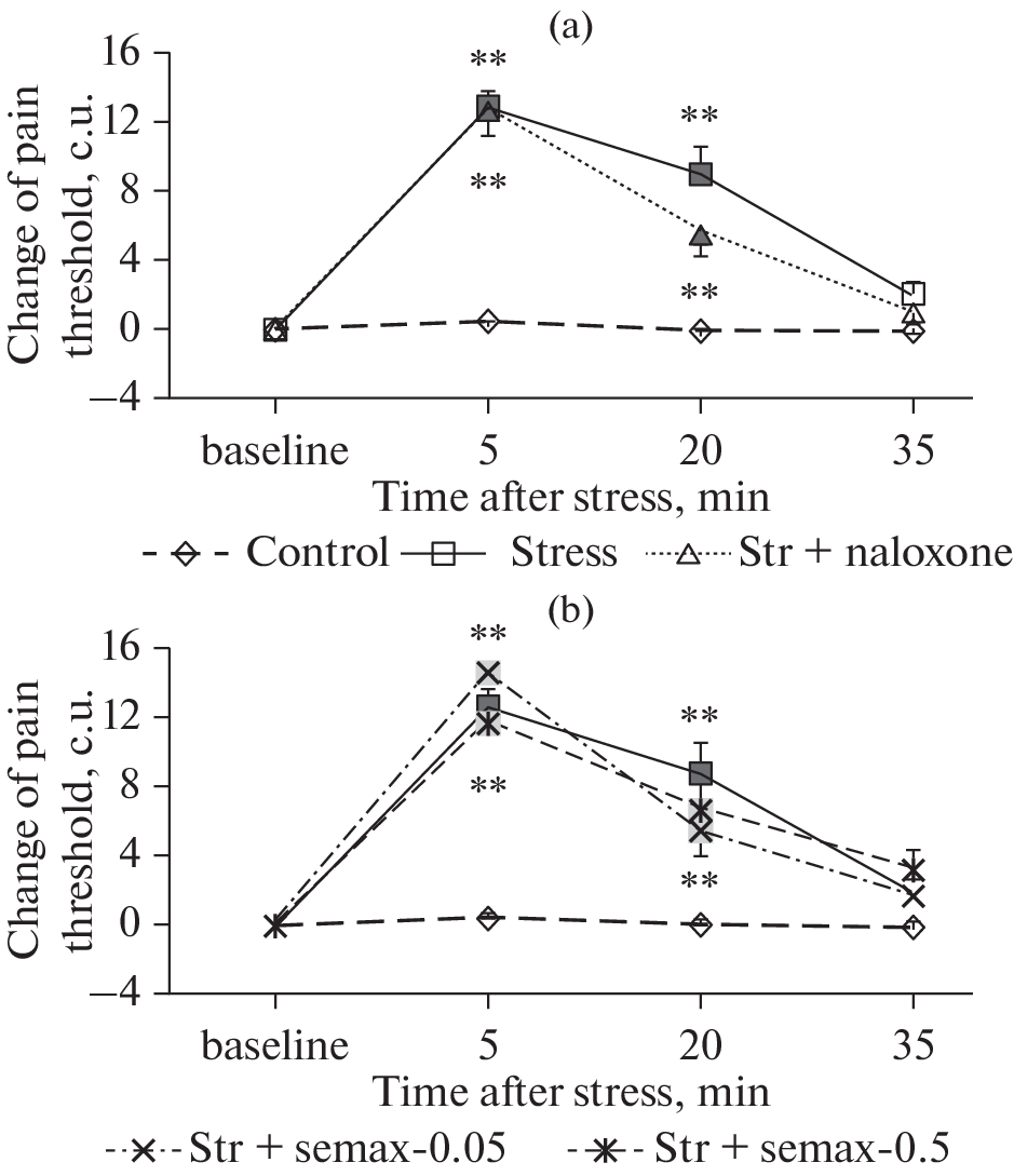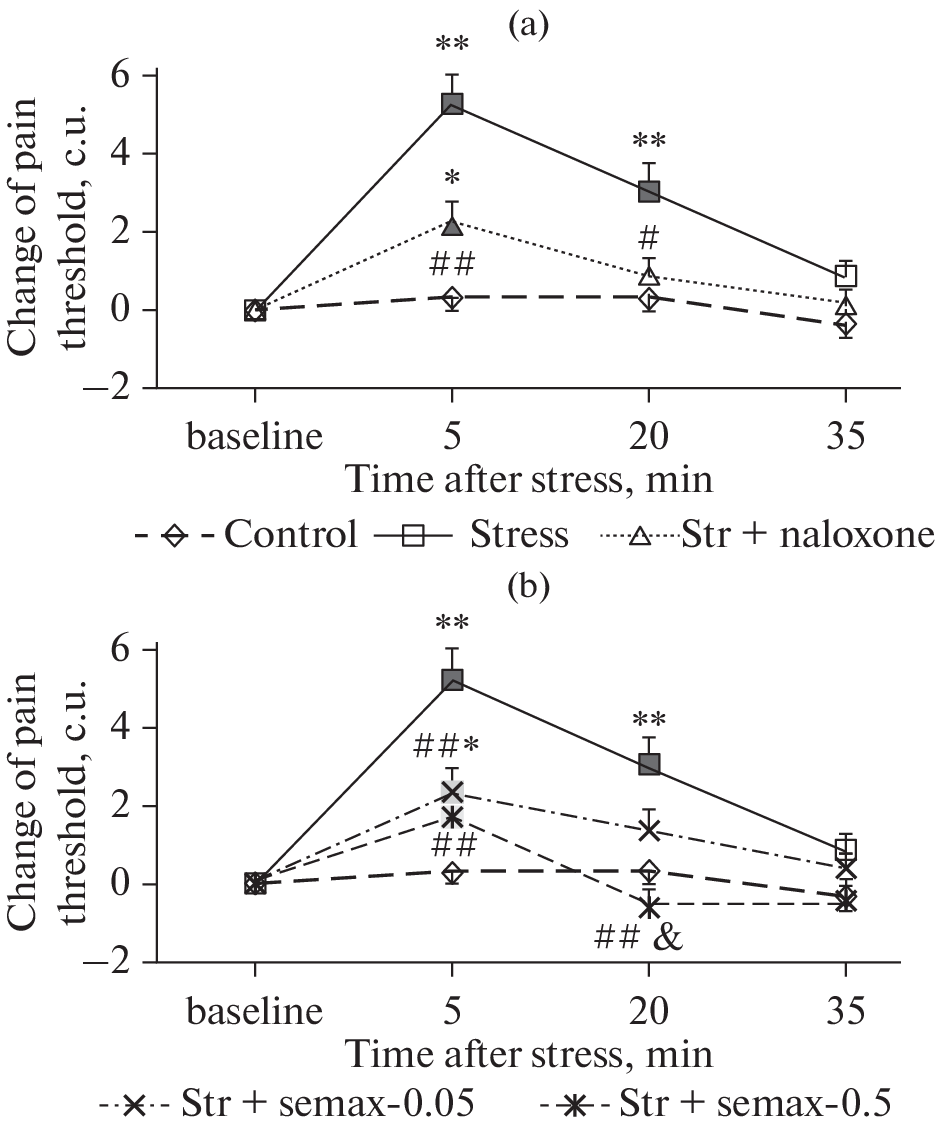 Acute stress exposure causes a cascade of neurochemical reactions, leading, in particular, to a change in behavior and increased tolerance to pain in humans and animals. ACTH/MSH-like peptides play an important role in regulating the body’s response to stressful exposures. The aim of the present study was to assess the effects of the ACTH4–10 analogue heptapeptide Semax in various models of acute stress. The effect of intraperitoneal Semax administration at doses of 0.05 and 0.5 mg/kg on changes in behavior and pain sensitivity of Wistar rats in models of inescapable intermittent foot shock stress and forced cold-water swim stress was investigated. To assess the involvement of the endogenous opioid system in the effects of stress, an impact of pretreatment with opioid receptor antagonist naloxone (1 mg/kg) was studied. The stressors used led to an increase in the pain threshold in the paw-pressure test, which indicates the development of stress-induced analgesia (SIA). In addition, rats exposed to stress had an decrease in exploratory behavior and an increase in the anxiety-like behavior in the hole board test. Both Semax and naloxone attenuated SIA in the model of inescapable foot shock stress, but did not affect the value of the pain threshold in the model of forced cold swim stress. Both studied drugs did not affect the behavior of rats in the models of acute stress used. It can be concluded that Semax blocks the opioid form of stress-induced analgesia, but does not affect the behavioral alterations in rats exposed to acute stress.