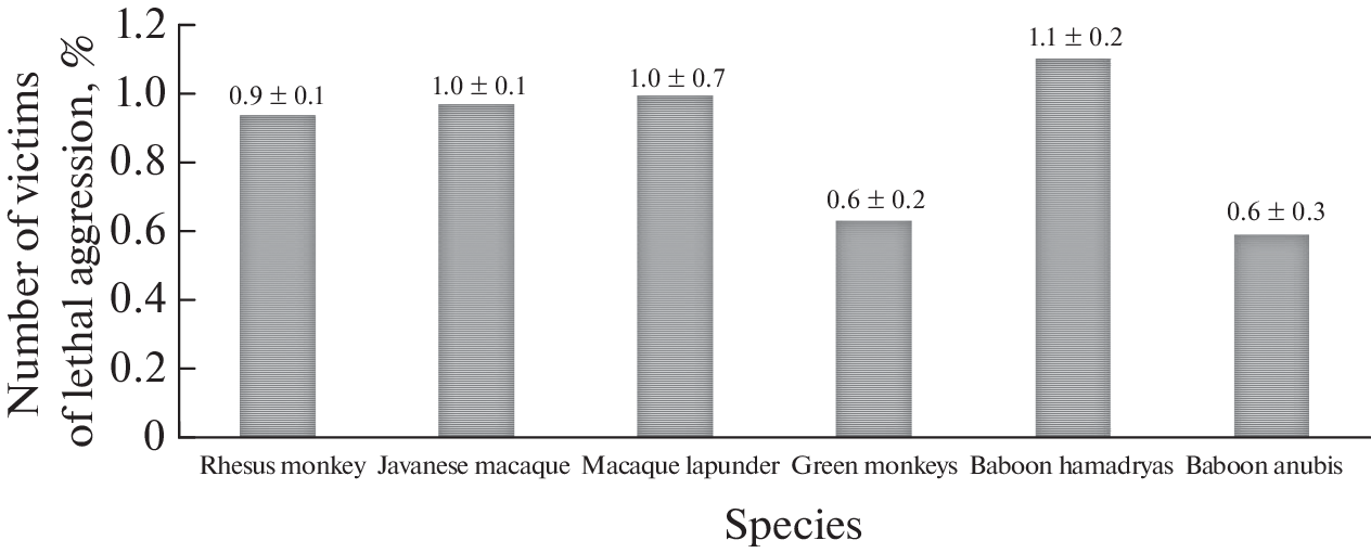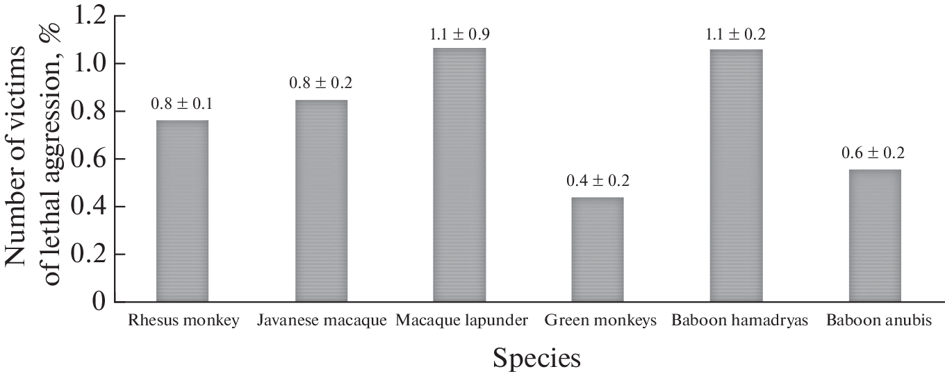 Establishing the characteristics of monkey lethal aggression, assessing the age and sex of aggressors and victims, and the nature of the aggressors' actions seems necessary to identify the evolutionary roots of cases of human lethal aggression. In addition, the study of the features of lethal aggression can be considered as a condition for the development of measures aimed at preventing its manifestations in captive monkeys. The aim of the study is to study the species-specific features of lethal aggression in captive macaques, baboons and guenons. An analysis was made of cases of intra-group lethal aggression that occurred over a 10-year period in Rhesus macaques (Macaca mulatta), Crab-eathing macaques (Macaca fascicularis), Pig-tail macaques (Macaca nemestrina), Green monkeys (Chlorocebus aethiops), Hamadryas baboons (Papio hamadryas), Anubis baboons (Papio anubis) kept by social groups. It has been established that cases of lethal aggression are observed in all 6 studied species of monkeys. It was shown that in groups consisting of adult males, the highest frequency of cases of lethal aggression was noted in Rhesus macaques, and the lowest in Hamadryas baboons. Species-specific differences were found in the nature of lethal aggression in monkey family groups consisting of males, females, infants, and adolescents. It has been established that in Hamadryas baboons, Anubis baboons and Pig-tail macaques, that is, in species with pronounced sexual dimorphism in body size and social status, the main form of lethal aggression in family groups is infanticide committed by a single sexually mature male. In Rhesus monkeys, Crab-eathing macaques and Green monkeys, that is, those species that are characterized by relatively mild sexual dimorphism in body size and social status, the predominant form of lethal aggression in family groups is the collective actions of females aimed at young and adult members of the group.