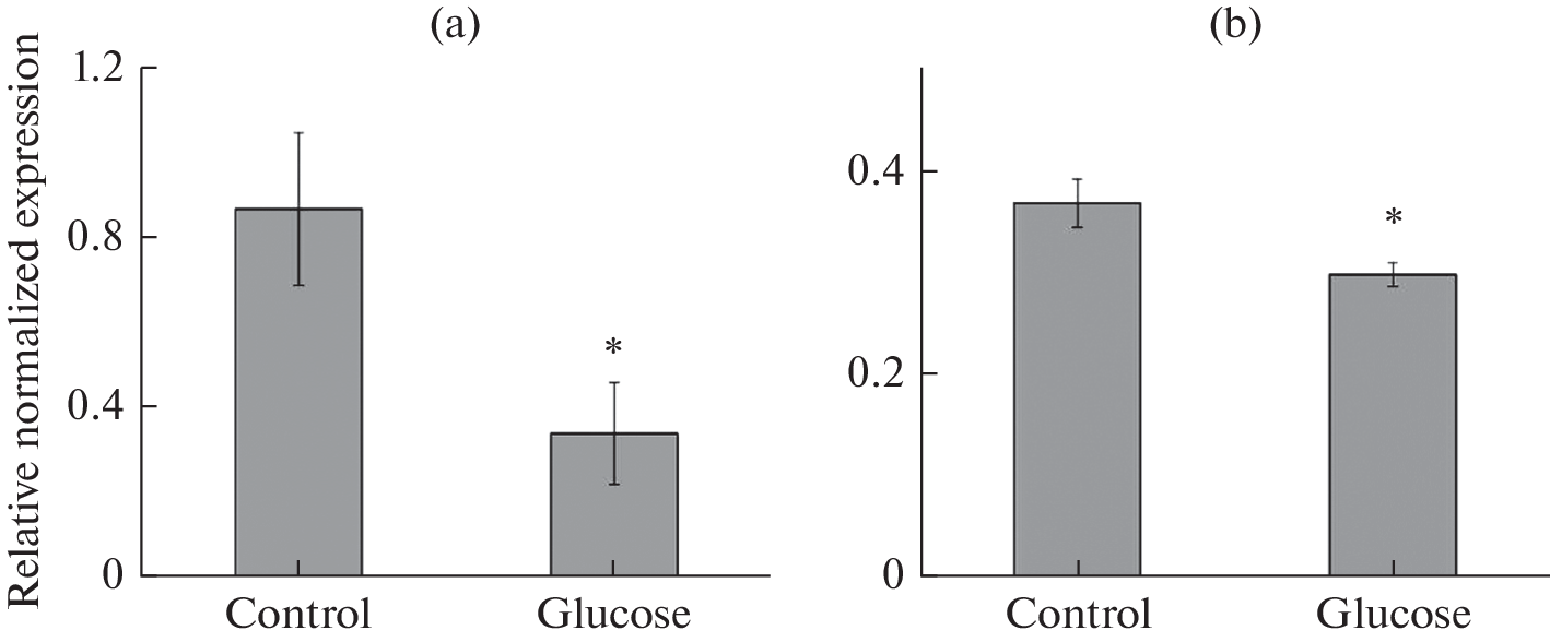 Glucose is widely used as an osmotic agent in the preparation of solutions for peritoneal dialysis. The aim of this work was to study the effect of glucose on the expression of the water channel aquaporin- 1 (AQP1) and the transcription factor TonEBP, as well as on water permeability of cells in the primary mesothelial mesentery culture of Wistar rats. The method of fluorescence microscopy with intracellular dye сalcein was used in the work. The mRNA content was evaluated by real time RT-PCR. Preincubation of cells in a DMEM medium containing glucose (2.3%, 24 hours, 37°C, 5% CO2) led to a decrease in the expression of the aqp1 gene by approx. 60% (control 0.87 ± 0.18; glucose 0.34 ± 0.12, n = 9, p < 0.05) and tonebp by 20% (control 0.37 ± 0.024; glucose 0.3 ± 0.012, n = 9, p < 0.05). A decrease by 40% in the permeability to water of the plasma membrane of peritoneal mesothelium cells after 24 h preincubation with glucose was also observed (control 7.3Е–3 ± 1.3Е–3 (sm/s), n = 27; glucose 4.3E–3 ± ± 3.8E–4 (sm/s), n = 57, p < 0.01). The results of the study indicate that glucose can have an inhibitory effec-t on the transport processes in the cells of the peritoneal mesothelium, which, with multiple exposures, can lead to structural and functional disorders of the peritoneal membrane.