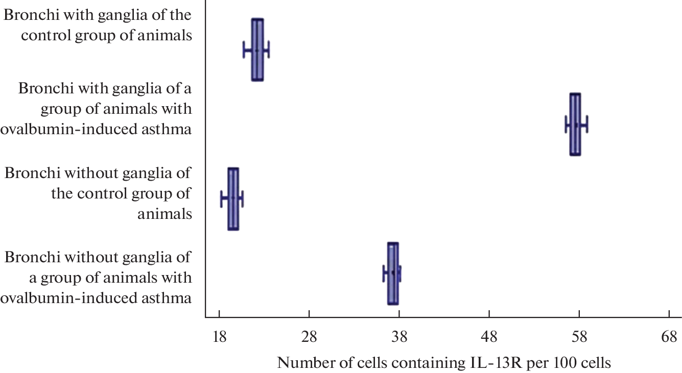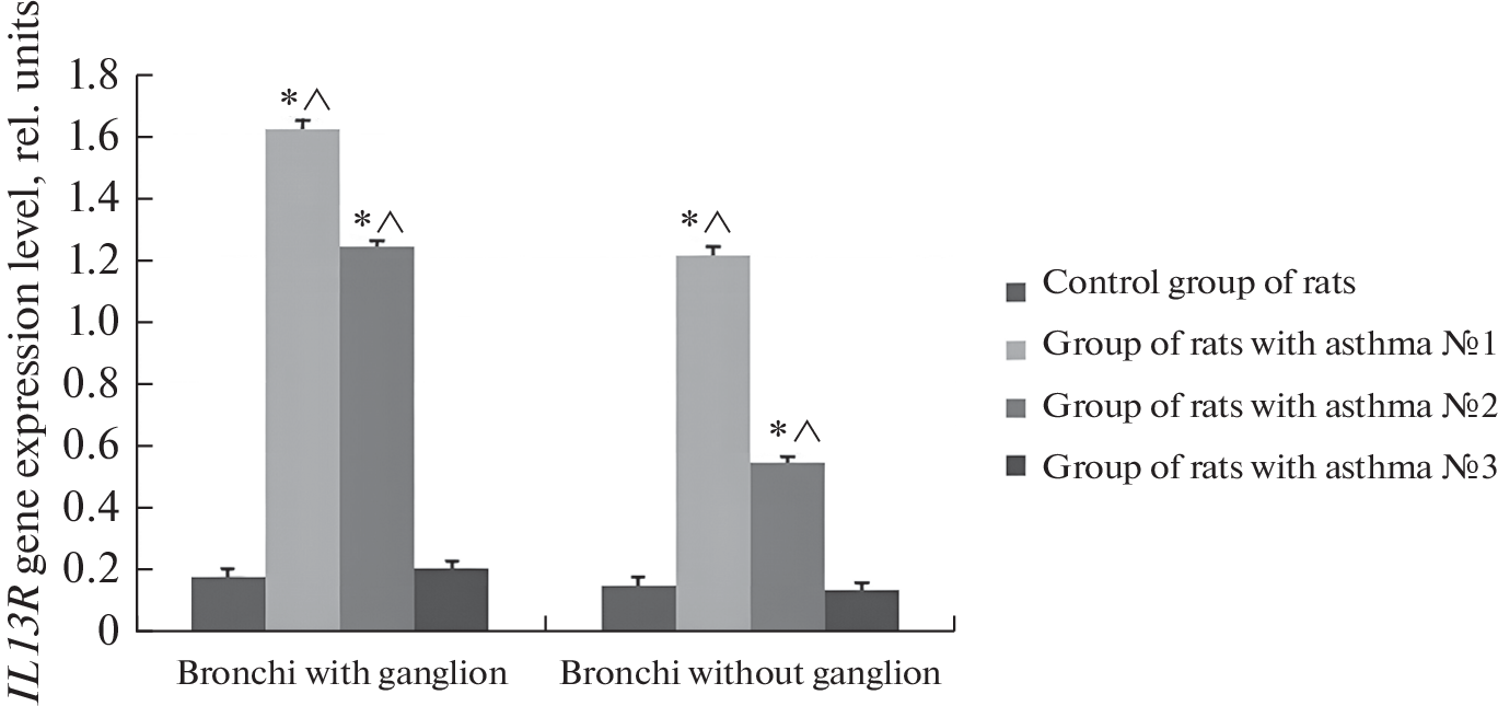 This article presents the results of studies of the levels of expression of the IL13R gene and the levels of expression of the molecular IL13R in the bronchi of control rats and rats with ovalbumin-induced asthma. The choice of these receptors is due to the great importance of these structures in the pathogenesis of allergic bronchial asthma. Biological materials of 64 Wistar rats were studied using real-time PCR and immunohistochemical methods. As a result of the studies, it was found that under conditions of asthma development in the tissues of the bronchi of rats, a pronounced expression of the IL13R genes, a significant expression of the molecular receptor for interleukin-13, occurs. In bronchi with an intramural ganglion (bifurcation zone), the level of IL13R gene expression and the level of expression of the IL13R molecular receptor were significantly higher than in tracheal samples without ganglia. Sodium cromoglycate, administered to rats 5 hours after the last inhalation of ovalbumin, led to a decrease in the mRNA content in the bronchi of animals compared to animals that did not receive mast cell stabilizer treatment.