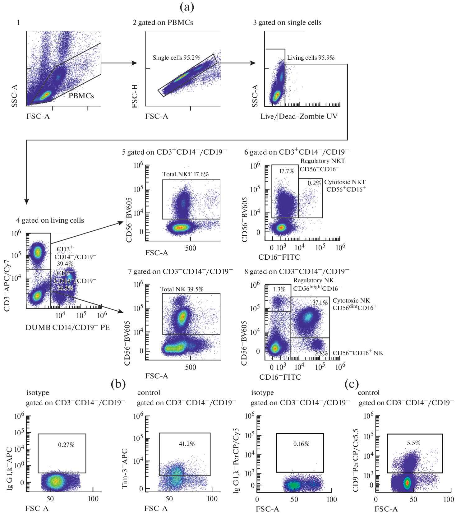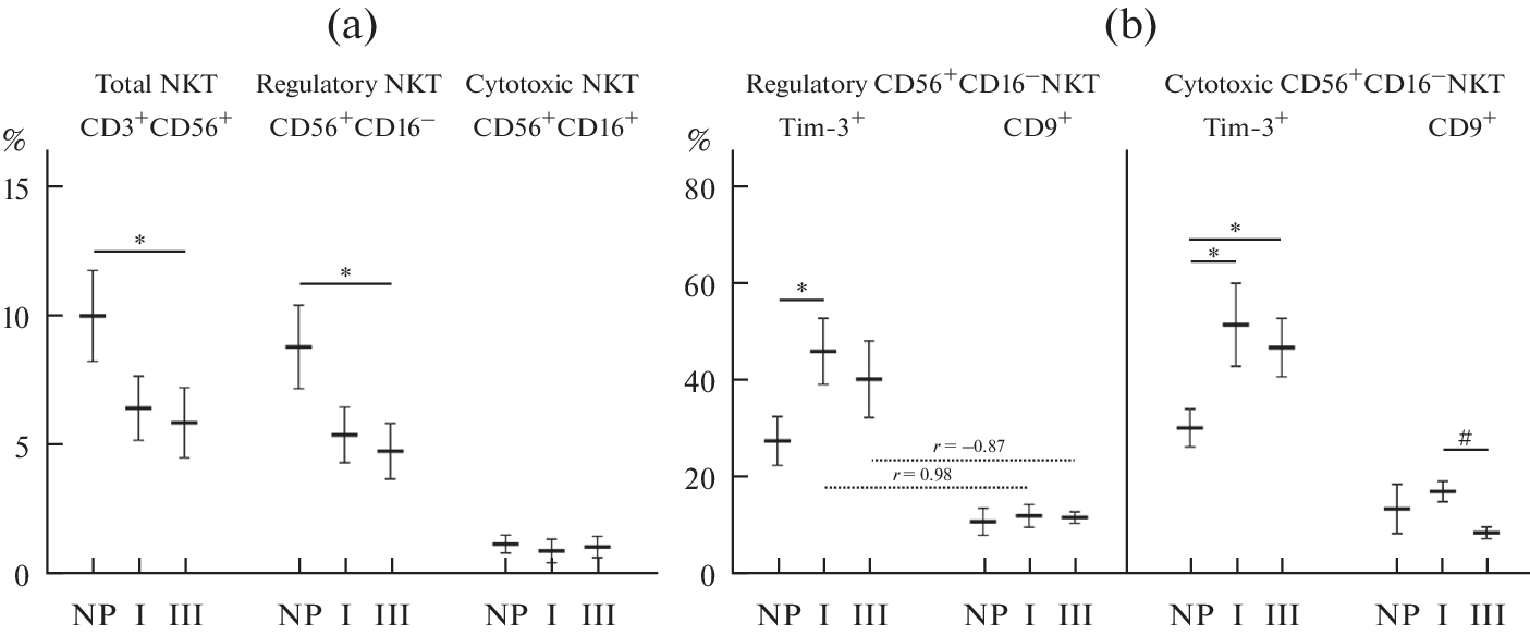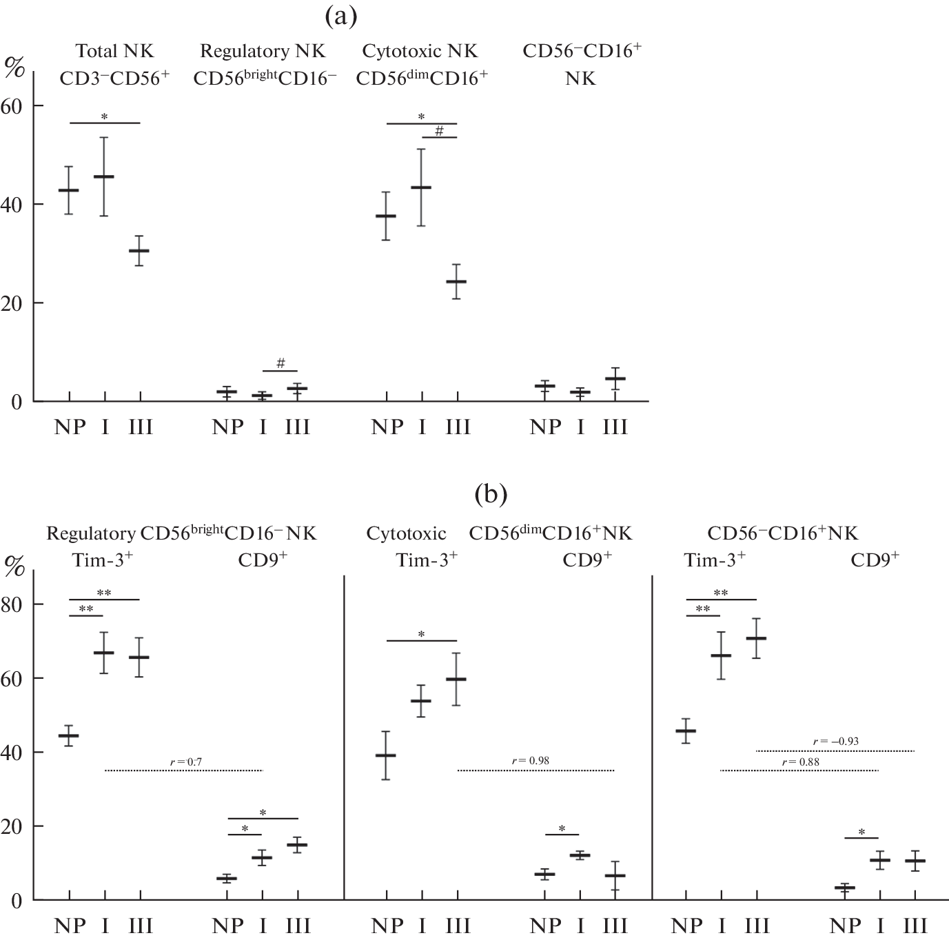 Natural killer cells (NK) and T-lymphocytes with NK functions (NKT) are the leading effectors of the mother’s immune tolerance to a semi-allogeneic fetus and have a fetal trophic effect during physiological pregnancy. Tim-3 (T-cell Ig and mucin domain-containing protein 3) and CD9 molecules play a critical role in the immunoregulatory and fetal trophic functions of NK and NKT, but their expression in peripheral blood cells has not been studied. The aim of this work was to study the expression of Tim-3 and CD9 in peripheral blood NK and NKT during physiological pregnancy. The object of the study was the peripheral blood of healthy women in I and III trimesters of a physiological pregnancy. The control group consisted of healthy non-pregnant women in the first phase of the menstrual cycle. Expression of Tim-3, CD9 molecules was analyzed by flow cytometry on regulatory NK (CD16–CD56bright) and NKT (CD16–CD56+), cytotoxic NK (CD16+CD56dim/–) and NKT (CD16+CD56+). It was found that in the first trimester of pregnancy, the total number and subpopulation composition of NK and NKT cells did not change. Tim-3 expression increased in all NK and NKT subpopulations, except for cytotoxic CD16+CD56dimNK. CD9 expression increased in all NK subpopulations, but in NKT did not differ from non-pregnant. At the same time, a direct correlation between CD9 and Tim-3 expressions was revealed in regulatory NK and NKT in the first trimester of pregnancy. In the third trimester, the regulatory CD16–CD56brightNK number increased, while cytotoxic CD16+CD56dimNK and regulatory CD16–CD56+NKT decreased compared to non-pregnant women. The number of CD16+CD56–NK did not change in I and III trimesters of a physiological pregnancy. Tim-3 expression was upregulated in all NK and cytotoxic NKT subpopulations, while CD9 was upregulated only in regulatory NKs. Thus, Tim-3 and CD9 molecule expressions of s on different NK and NKT subpopulations changed during I and III trimesters of a physiological pregnancy, which plays an important role in the regulation of their phenotype and functions.