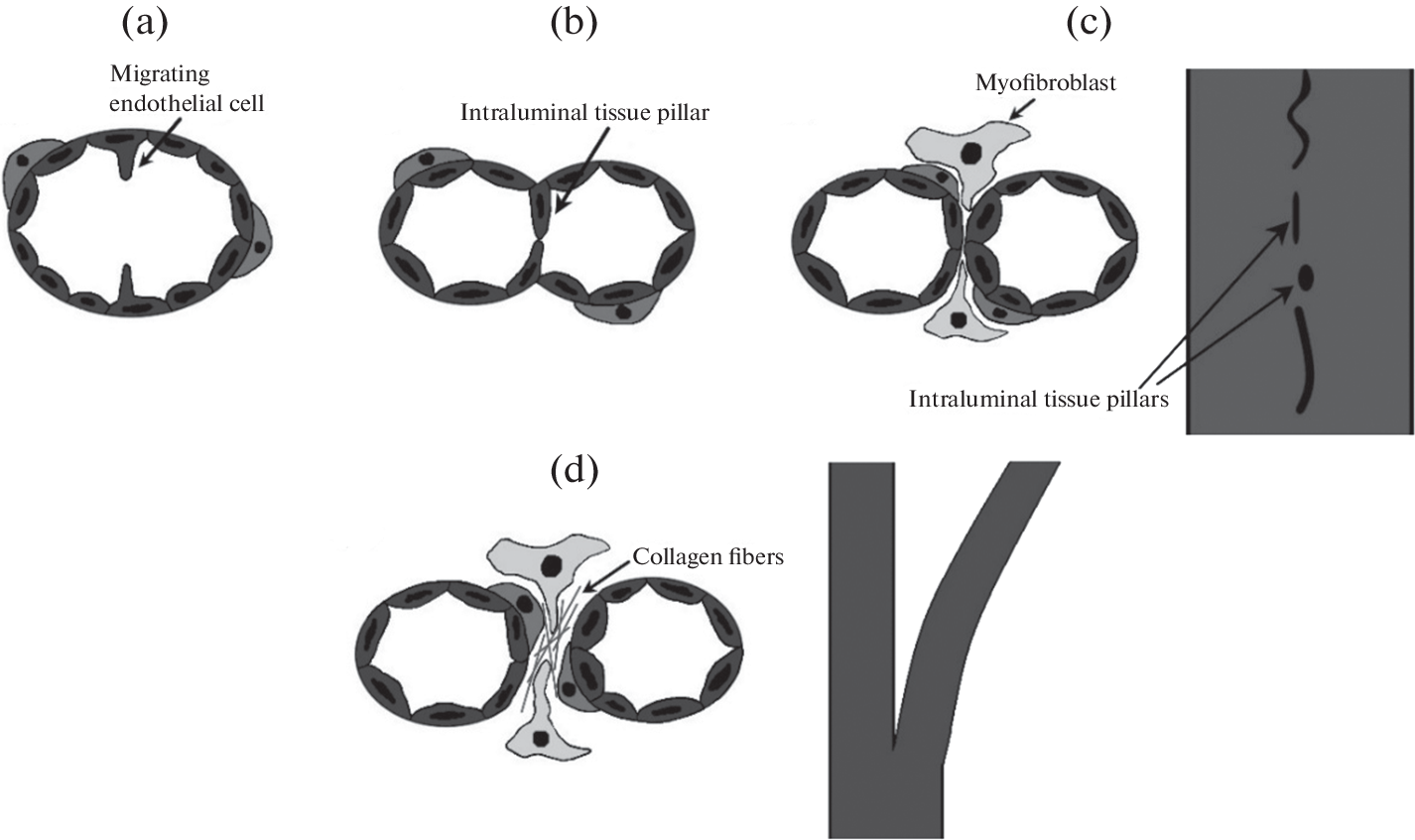 Angiogenesis is the formation of blood vessels from existing vasculature to provide n-ormal tissue perfusion. Angiogenesis is also necessary for the processes of growth and regeneration. Angiogenesis attracts the attention of researchers from the position of its therapeutic regulation: enhancement can contribute to significant progress in the treatment of ischemic diseases, and inhibition is actively studied for the treatment of neoplastic diseases. Regulation of angiogenesis is impossible without accurate knowledge of its mechanism. There are two fundamental pathways for angiogenesis: sprouting angiogenesis, which is mediated by an existing vessel’s endothelial cells migration into the extracellular matrix to form a vessel in the direction of angiogenic stimuli, and intussusceptive angiogenesis, which is mediated by dividing the formed vessel into two new ones as a re-sult of the formation of a partition inside it that separates two independent lumens. This review examines the main stages of each type of physiological angiogenesis, their mechanisms and regulation.
