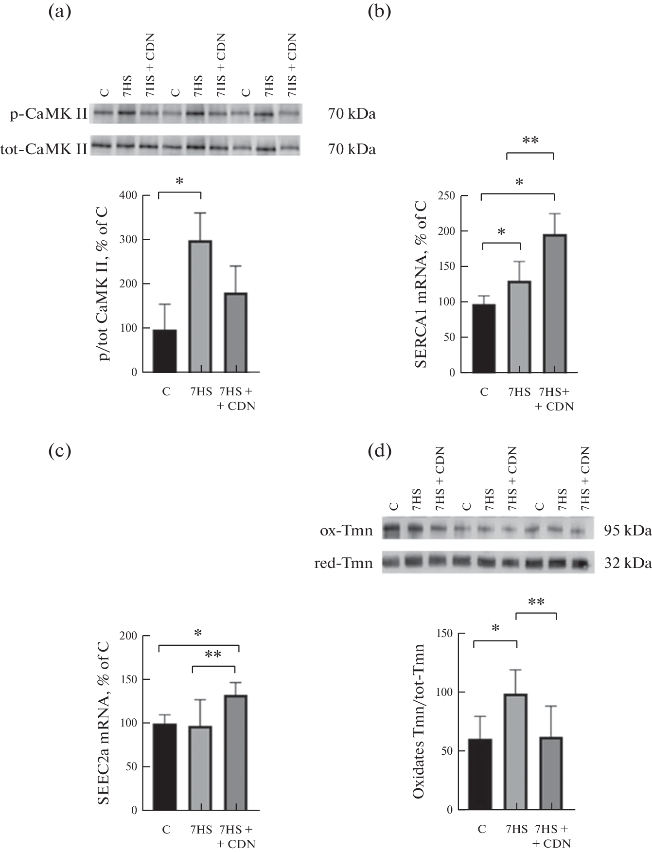 Dysfunction of skeletal muscles and their atrophy during unloading are accompanied by excess calcium accumulation in the myoplasm of muscle fibers. We hypothesized that calcium accumulation may occur, among other reasons, due to inhibition of SERCA activity under muscle unloading. In this case, the use of a SERCA activator will reduce the calcium level in the myoplasm and prevent the consequences of unloading. Male Wistar rats were divided into 3 groups: vivarium control with placebo administration (C, n = 8), 7-day suspension group with placebo administration (7HS, n = 8) and 7-day suspension group with intraperitoneal administration of SERCA CDN1163 activator (50 mg/kg (7HS + CDN), n = 8). One m. soleus of each rat was frozen in liquid nitrogen, the second was tested for functional properties. In the 7HS group, increased soleus fatigue was found in the ex vivo test, a significant increase in mRNA and the number of fast muscle fibers, an increase in the level of calcium-dependent CaMK II phosphorylation and the level of tropomyosin oxidation, as well as a decrease in the content of mitochondrial DNA and protein. All these changes were prevented in the SERCA CDN1163 activator group. Conclusion: 7-day SERCA activator administration does not delay of soleus atrophy, but prevents the development of its fatigue, probably by preventing a decrease in the number of type I fibers and markers of mitochondrial biogenesis.