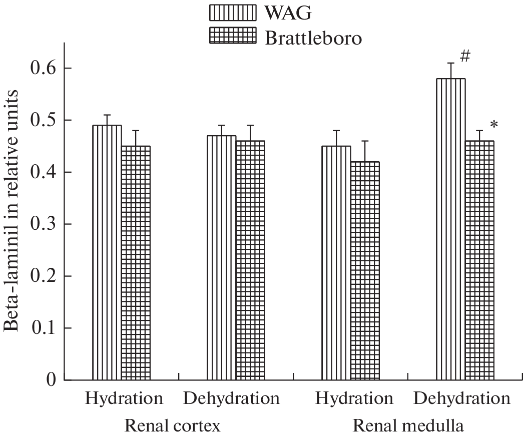Laminin is the main water-soluble protein in the basement membrane of epithelial tissue. The content of laminin in the renal parenchyma was studied in rats that were on an alternative water diet for 60 h with excessive water intake or a complete lack of drinking water in the food. It has been shown that the osmotic concentration of urine, which develops as a result of water deprivation, is accompanied by a quantitative change in the composition of laminin. It has been established that the amount of laminin beta chain increases in the kidney medulla of dehydrated rats. This effect is observed only in WAG rats with normally expressed vasopressin gene and is absent in mutant Brattleboro rats unable to synthesize the hormone. The increase in the level of beta-laminin also does not extend to the cortical substance. Based on the original and new data, it is assumed that laminin, as a key regulatory element in the basement membrane of the tubular epithelium, participates in the adaptive reaction of the concentrating system of the kidney to conditions of prolonged dehydration. Hyperhydration does not affect the level of laminin in the renal parenchyma.