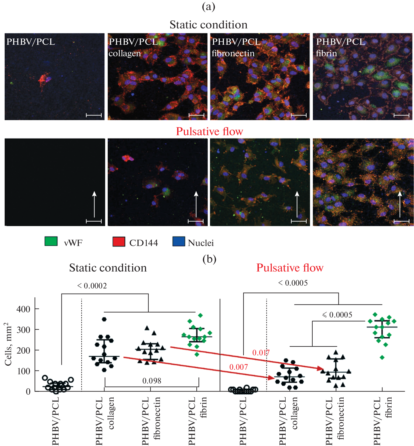The presence of a modifying coating based on extracellular matrix proteins on the inner surface of vascular prostheses is known to enhance endothelial cell adhesion and prevent detachment under pulsating flow conditions. This coating effectively reduces the risk of thrombosis and plays a critical role in determining implantation outcomes. Although proteins like collagen, fibrin, and fibrinogen are commonly used as coatings to improve cell adhesion, their relative effectiveness remains uncertain. Objective: This study aims to identify the optimal coating, based on extracellular matrix proteins, that preserves prosthesis functionality and maintains endothelial layer integrity under pulsating flow conditions. Methods: Scaffolds and vascular prostheses were fabricated using poly(3-hydroxybutyrate-co-3-hydroxyvalerate) and poly(ε-caprolactonone) through an electrospinning process. These structures were then modified with collagen I, fibronectin, or fibrin. Endothelial colony-forming cells (ECFCs) were seeded onto the protein-modified electrospun samples and cultured under both static and dynamic conditions. After a 3-day incubation period under static conditions, cell viability, metabolic and proliferative activity, as well as adhesive properties, were evaluated. Adhesive properties were assessed by analyzing the area occupied by the focal adhesion protein paxillin. Cell retention was determined by comparing cell density on the inner surface of 4 mm diameter vascular prostheses after a 7-day incubation period, both under pulsating flow conditions and static conditions. Results: Cell metabolic activity, viability, number, proliferation, and the area occupied by the focal adhesion protein paxillin were found to be significantly higher in samples coated with fibrin compared to those coated with collagen I and fibrinogen. The cell density (cells/cm2) of ECFCs on the inner surface of fibrin-coated prostheses showed no significant difference between dynamic and static conditions. In contrast, collagen and fibronectin coatings resulted in approximately half the cell density under pulsating flow conditions compared to static conditions. Conclusion: The fibrin coating demonstrated superior biological activity, adhesive properties, and preservation of the endothelial layer under both static and pulsating flow conditions, as compared to collagen I and fibronectin coatings. Consequently, the utilization of fibrin coating emerges as a promising option for modifying the inner surface of vascular prostheses.