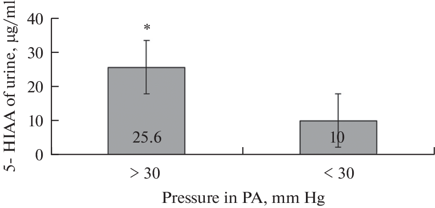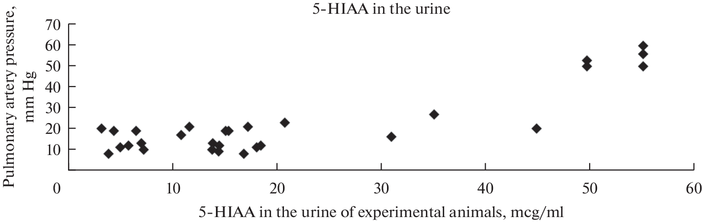 При легочной артериальной гипертензии подавление пролиферации эндотелиальных клеток сосудов и взаимодействие эндотелиальных с гладкомышечными клетками нарушены. Выявлено участие 5-НТ2a-рецепторов в митогенном действии на эндотелиальные, а 5-НТ2b-рецепторов на гладкомышечные клетки сосудов. Известно, что одним из основных органов, в котором происходит метаболизм серотонина, является легкое. В эндотелиальных клетках сосудов легких под действием фермента моноаминоксидазы А серотонин превращается в 5-гидроксииндолуксусную кислоту (5-ГИУК), которая впоследствии выводится с мочой. В настоящее время при лечении детей с легочной гипертензией не учитывается роль 5-HT2-рецепторов. Нами модифицирована монокроталиновая модель легочной гипертензии для неполовозрелых крыс-самцов. Также разработана и апробирована схема введения блокатора 5-НТ2-рецепторов для профилактики и лечения легочной гипертензии у неполовозрелых крыс. В нашем исследовании выявлена положительная корреляция концентрации 5-ГИУК в моче со степенью легочной гипертензии, что может стать потенциальным маркером этого заболевания. Полученные данные свидетельствуют о развитии легочной гипертензии у неполовозрелых крыс самцов после однократного введения монокроталина в виде замещения легочной ткани фиброзной, развитием пневмосклероза и бронхоэктазов. Также у животных в данной модели формируются изменения структуры сердечной мышцы и сосудистой стенки с развитием фиброзной ткани, что может свидетельствовать о вовлеченности 5-HT2-рецепторов в активацию фибробластов и соответственно в патогенез легочной гипертензии.