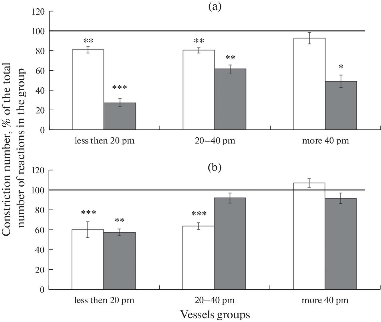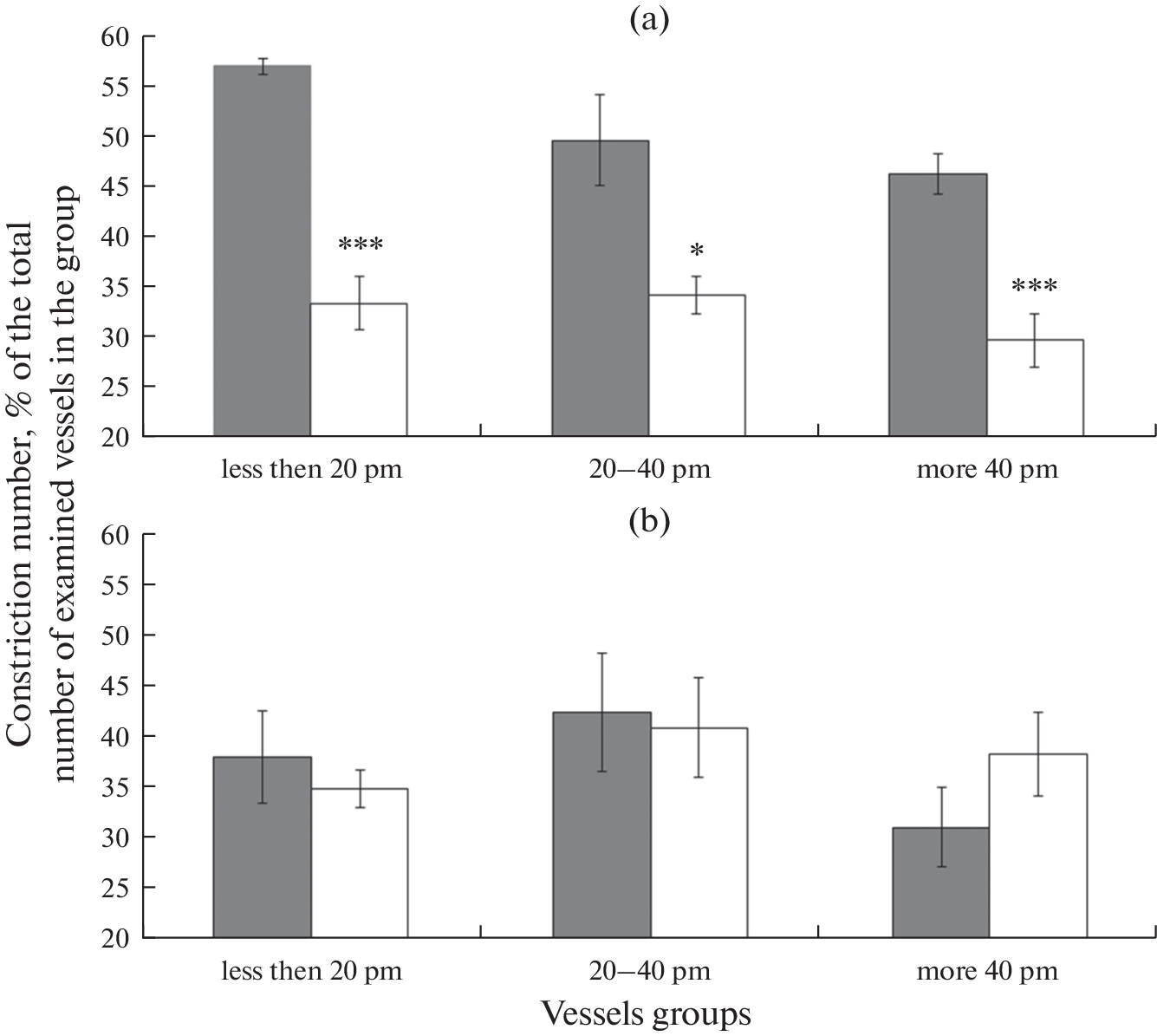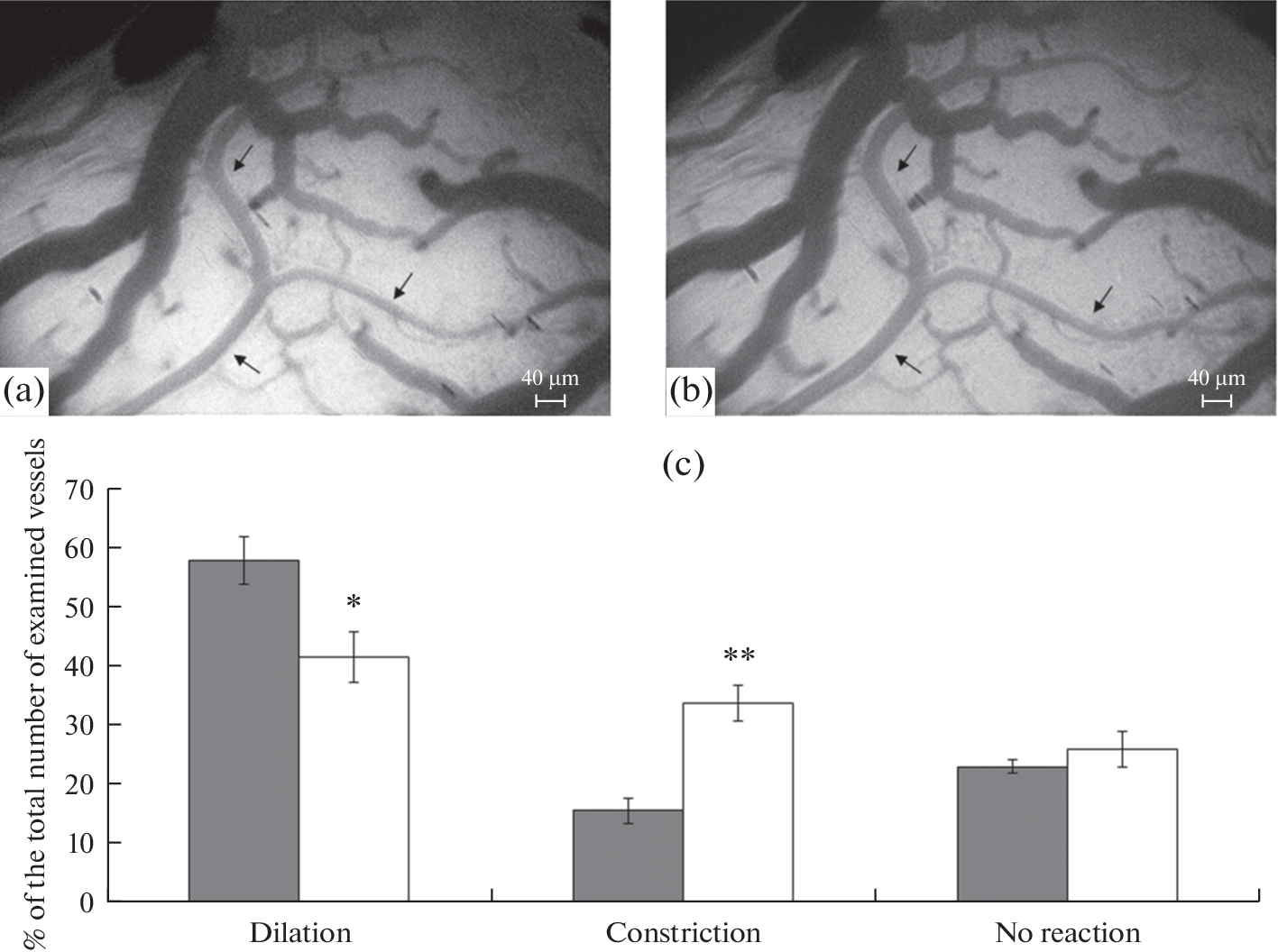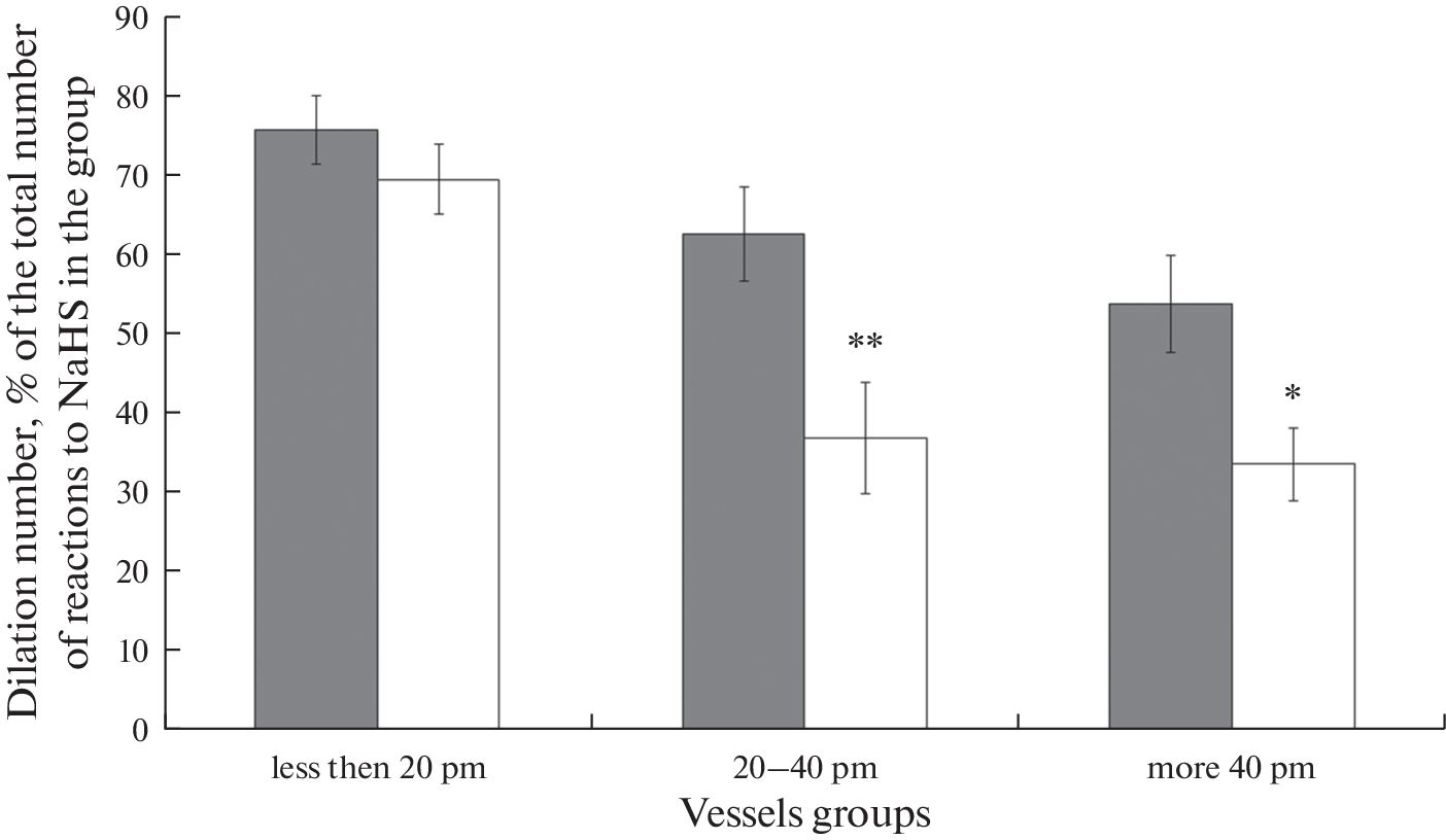 Проведено исследование реакций пиальных артерий на воздействие экзогенного сероводорода и оценка вклада КАТФ- и BKСa-каналов в H2S-опосредованную дилатацию у крыс разного возраста. Методом прижизненной микрофотосъемки у крыс Sprague-Dawley в возрасте 4 и 18 мес. исследовались реакции пиальных а-ртерий различных диаметров на воздействие раствора донора экзогенного сероводорода – гидросульфида натрия (NaHS, 30 мкМ), а также их изменение при предварительном применении блокаторов калиевых каналов: КАТФ (глибенкламид, 10 мкМ) и BKCa (тетраэтиламмоний, 2 мМ). Установлено, что у крыс с возрастом происходит угнетение H2S-индуцированной дилатации пиальных артерий и увеличение констрикторных ответов на воздействие экзогенного сероводорода. Возрастные изменения H2S-индуцированной дилататорной реакции пиальных артерий у крыс зависят от размера сосудов. С возрастом уменьшается число дилатаций артерий диаметром больше 20 мкм. При этом старение не влияет на дилатацию более мелких артерий. Эти нарушения могут быть связаны с изменениями процессов, обусловленных активацией калиевых каналов. Обнаружено, что старение сопровождается увеличением вклада КАТФ-каналов в осуществление H2S-опосредованной дилатации пиальных артерий диаметров менее 40 мкм. Вклад BKСa-каналов в дилатацию с возрастом снижается: у 18-месячных крыс эти каналы практически не участвуют в H2S-опосредованной дилатации пиальных артерий диаметром более 20 мкм.