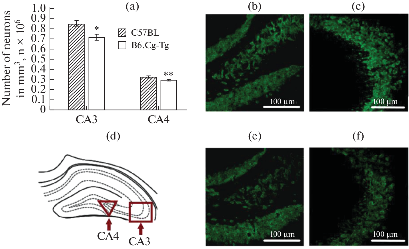 Parkinson’s disease (PD) is a progressive age-related neurodegenerative pathology of the central nervous system, characterized by a selective loss of dopaminergic neurons of the nigrostriatal pathway and by the presence of specific inclusions (Lewy bodies) in dopamine neurons. To study the mechanisms of this pathology and to search for possible ways to correct it, genetic models of PD in mice have been created. Transgenic mice of the B6.Cg-Tg(Prnp-SNCA*A53T)23Mkle/J strain (referred as B6.Cg-Tg further in the text) represent a model of PD, have the A53T mutation in the human alpha-synuclein gene. The aim of this work was to study the locomotor activity and the level of anxiety, as well as the density of neurons in the brain of male B6.Cg-Tg mice at the age of six months. Wild type C57BL/6J mice of the same sex and age were used as controls. The results of the current study demonstrate that B6.Cg-Tg mice are characterized by the high locomotor activity and the low anxiety. Besides, a selective decrease in the density of neurons in the subventricular zone, the substantia nigra, as well as the CA1, CA3, CA4 zones and the granular layer of the dentate gyrus of the hippocampus was observed in these mice. Thus, mice of the B6.Cg-Tg strain at the age of six months only partially correspond to the main pathophysiological signs of PD. Decrease in the density of neurons in the substantia nigra, as well as in the CA1 and CA3 zones of the hippocampus of B6.Cg-Tg mice resemble similar changes in PD. However, these mice demonstrated neither bradykinesia nor high level of anxiety.