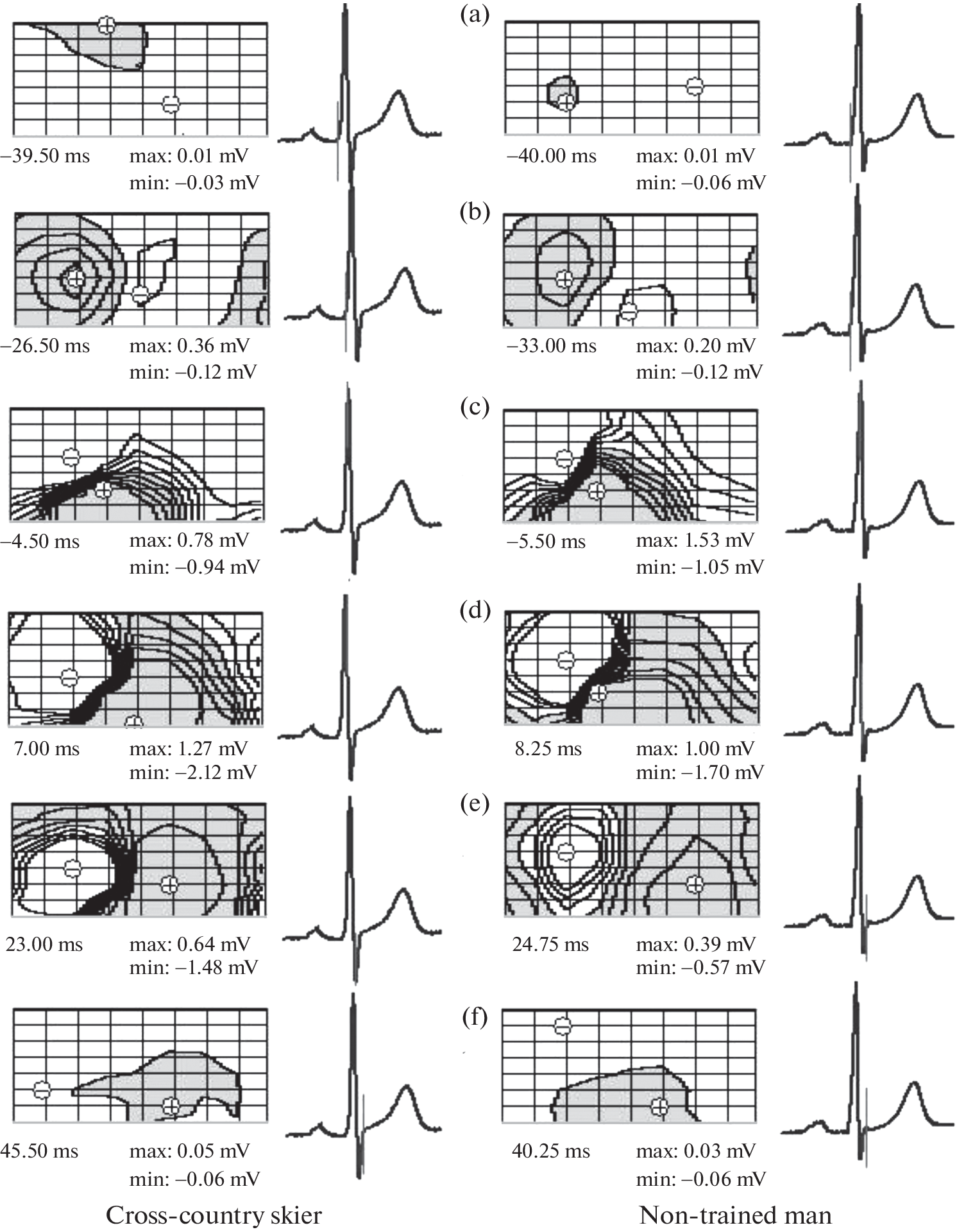 The article is focused on the study of the electrical remodeling of the “sports heart” using multichannel ECG mapping to make a more detailed and informative analysis of the excitation of the myocardium remodeled by sport activity. The study of the heart electrical activity was carried out from 64 unipolar electrodes on the thorax surface synchronously with standard limb leads in highly trained cross-country skiers (n = 15) and young non-trained men (n = 19) at rest. The amplitude-temporal and spatiotemporal characteristics of the electric field of the heart were measured. By the typical distribution of areas of the negative and positive cardiac potentials the durations of depolarization and its individual phases were estimated. ECGII was used to determine the duration of the R-R, PQ (PR), QRS, QT, QTc intervals; in the unipolar lead V5 the R-wave peak time (RWPTV5) was measured. In athletes, the duration of PQII, QTII, QTcII, RWPTV5 intervals were statistically significantly longer than in non-trained men. Analysis of the electrical field of the heart showed a difference in the ratio of the phases of ventricular depolarization in athletes and non-trained individuals at rest. The onset of ventricular depolarization and the first inversion of cardiac potential in athletes were significantly earlier than in non-trained people, while the completion and total duration of the period of ventricular depolarization did not differ. In skiers, the duration of the first inversion was significantly longer than in non-trained individuals; a tendency to shortening of the second period of stable location of potentials on the thorax surface was also shown. The use of surface ECG mapping made it possible to reveal differences in the spatiotemporal organization of heart ventricular depolarization between cross-country skiers and non-trained men at rest. The results of the study may be useful in the analysis of the electrical remodeling of the heart in athletes training the physical quality of endurance.