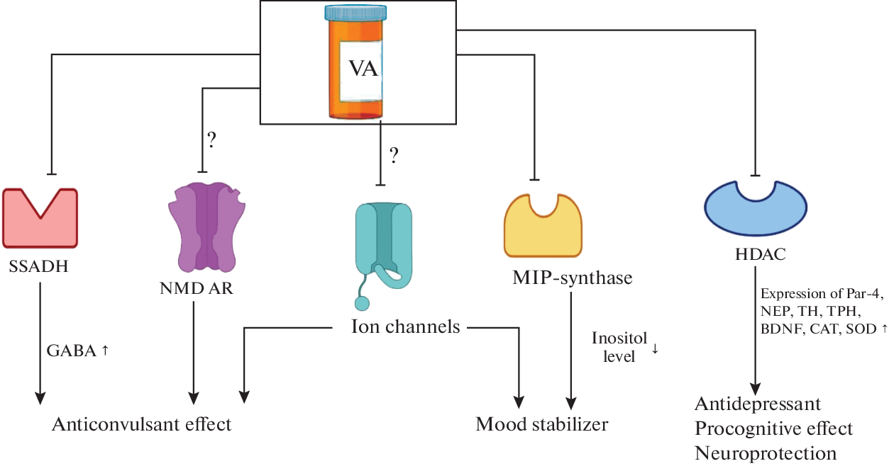 Valproic acid (valproate, VA) has been widely used as an antiepileptic agent for several decades, as well as in the treatment of bipolar affective disorder. For many years, the ability of VA to stop epileptic seizures of a different nature has been associated with increased GABAergic neurotransmission, inhibition of glutamatergic neurotransmission and a general decrease in CNS hyperactivity by acting on ion channels, however precise mechanisms of VA anticonvulsant effects are still not clear. Over time, the effects of VA on other neurotransmitter systems, enzymes and intracellular signalling pathways have been revealed, however they do not explain the effectiveness of the drug as an anticonvulsant and mood stabilizer, but only expand its pharmacological profile. Over the past 10 years, the focus of interest in valproate research has changed due to its ability to alter gene expression both by inhibiting histone deacetylases and by changing levels of DNA methylation. These new studies reveal alternative mechanisms of valproate action rather than trying to test and confirm hypotheses previously put forward.