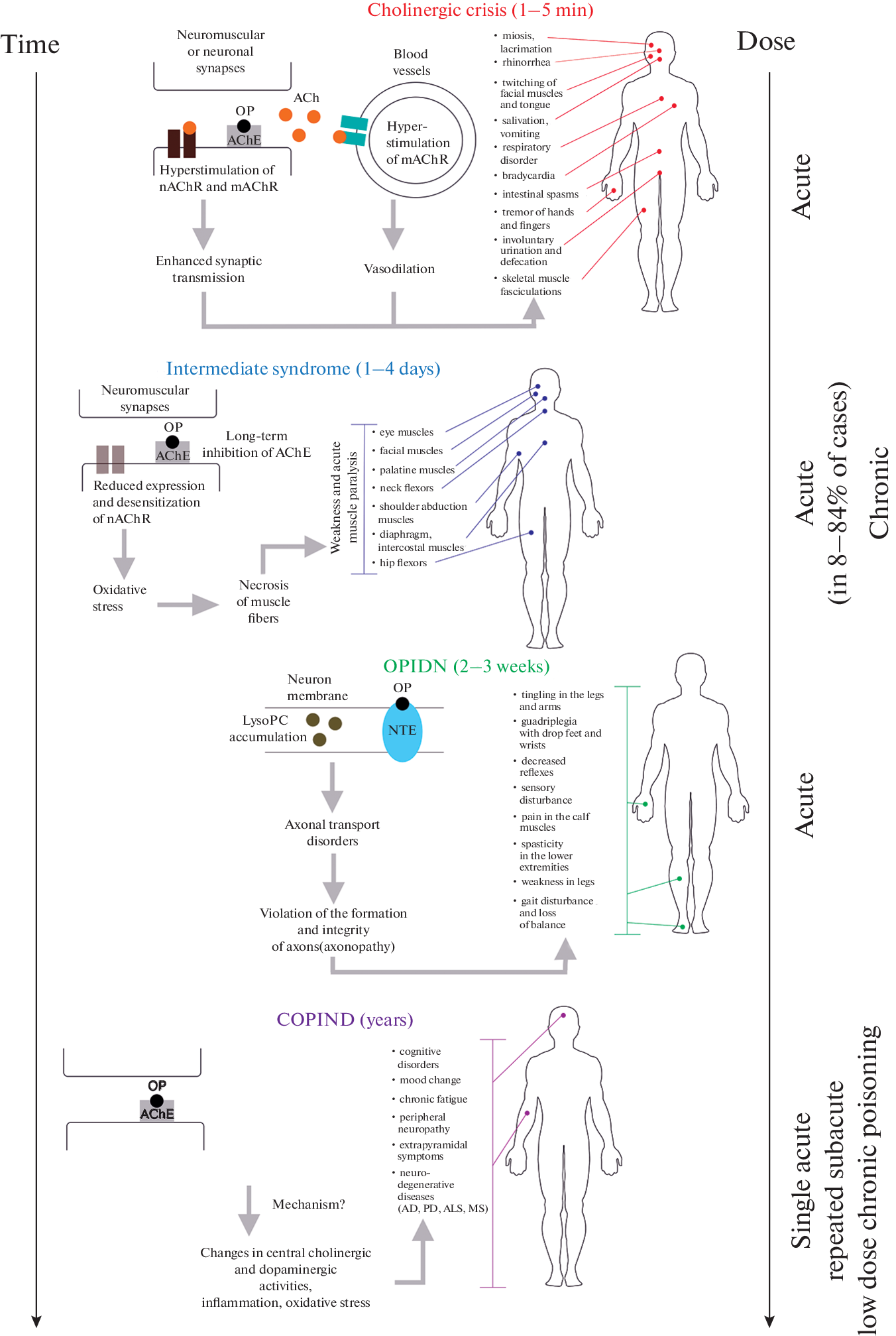 Organophosphates (OP) are one of the most common neurotoxic xenobiotics. In acute OP poisoning, as a result of suppression of synaptic acetylcholinesterase (AChE) activity, a cholinergic syndrome develops, which can transform into status epilepticus. Within a few days after acute poisoning, the so-called an intermediate syndrome can develop, which is associated with prolonged inhibition of AChE, desensitization of nicotinic receptors, and functional degradation of synapses and muscle fibers. In 10–20 days after a single acute or repeated subacute poisoning, OP-induced delayed polyneuropathy (OPIDN) can develop – a neurodegenerative disease, the signs of which are ataxia, loss of function of the distal sensory and motor axons of peripheral nerves. The occurrence of a neuropsychiatric disorder (NPD) caused by chronic exposure to relatively low-toxicity organophosphorus compounds is usually not associated with acute poisoning; symptoms include cognitive impairment, chronic fatigue, and extrapyramidal symptoms. The list of possible diseases or pathological conditions (syndromes) that develop as a result of acute, subacute or chronic effects of OP on the human body has expanded in recent years due a number of known neurodegenerative diseases (Alzheimer’s, Parkinson’s, multiple sclerosis, etc.). The aging of the body in general and the aging of the brain in particular are considered in the review from the point of view of the consequences of OP poisoning, which can serve as a nonspecific trigger of aging and related neurodegenerative diseases. Gulf syndrome is not a consequence of OP intoxication, but is also of interest and is considered in the context of OP-induced pathology, since its etiology and pathogenesis are associated with the exposure to cholinesterase inhibitors. The review presents data indicating the important role of the vascular endothelium in the development of OP-induced pathology; The first suggestions were made by clinicians in the late 1980s, and the first experimental data were obtained in the early 2000s. The principles of therapy for acute poisoning are outlined, taking into account experimental data from recent years. Some methods for studying OP in experiments in vitro, ex vivo and in vivo with laboratory animals, including the use of carboxylesterase inhibitors, are presented. The most important part of in vivo investigations has been and remains the search for new biomarkers to assess the effectiveness of adjuvant and regenerative therapies.