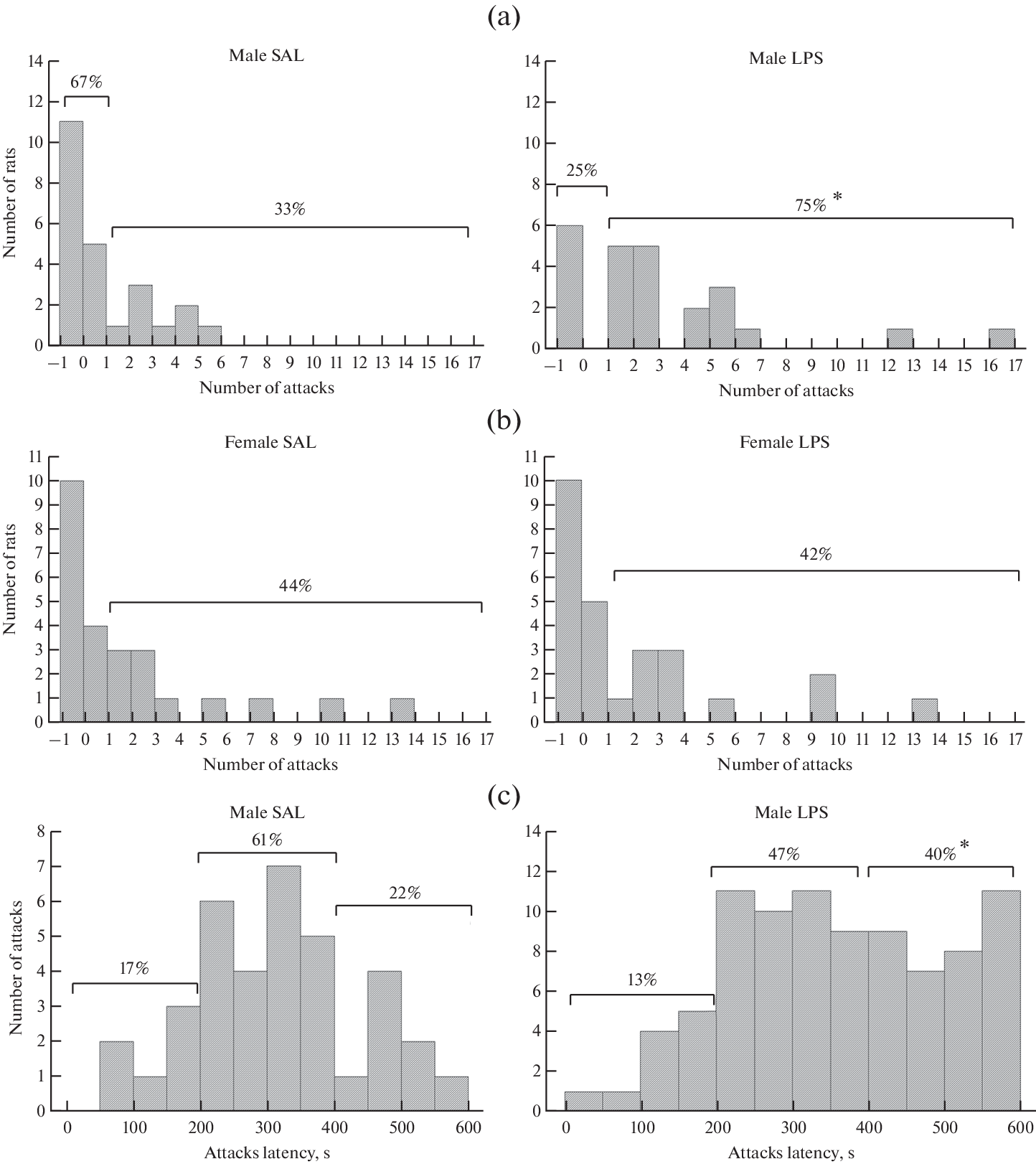 Stresses in early ontogenesis can influence anxiety-depressive, defensive and social behavior, as well as the immune and hormonal reactivity of adult animals. The model of early proinflammatory stress assumes activation of the immune system by the introduction of bacterial lipopolysaccharide (LPS) in early ontogenesis. Whether neonatal LPS stress impacts aggressive behavior or sexual motivation is still unknown. Pathological aggressiveness and disorders in sexual behavior are characteristic of many neuropsychiatric diseases, therefore, the study of the prerequisites for their occurrence is highly relevant. On the 3rd and 5th day after birth, the rats were injected with either LPS at a dose of 50 mcg/kg (LPS group) or saline solution (SAL group, control). The aggressive behavior of adult rats in the resident-intruder test after a week of social isolation was analyzed, as well as the sexual preference of males or females in a three-chamber test. The behavior of rats was compared with baseline levels of corticosterone and interleukin-1beta in blood serum. The males of the LPS group compared with the control had more attacks on the intruder in the resident-intruder test, and the number of attacks did not decrease by the end of the experiment. The males of the LPS group had an increased interaction time with the female at the diestrus stage in the social preference test of males and females. There were no changes in aggressive behavior in females after the administration of LPS in early ontogenesis. The baseline level of interleukin-1beta was higher in males, and corticosterone was higher in females, there were no differences between the LPS and PHYS groups in biochemical parameters. The results obtained indicate an increase in aggressiveness provoked by social isolation, as well as sexual motivation in adult males after early pro-inflammatory stress, i.e., a change in the motivational and emotional component in social behavior.