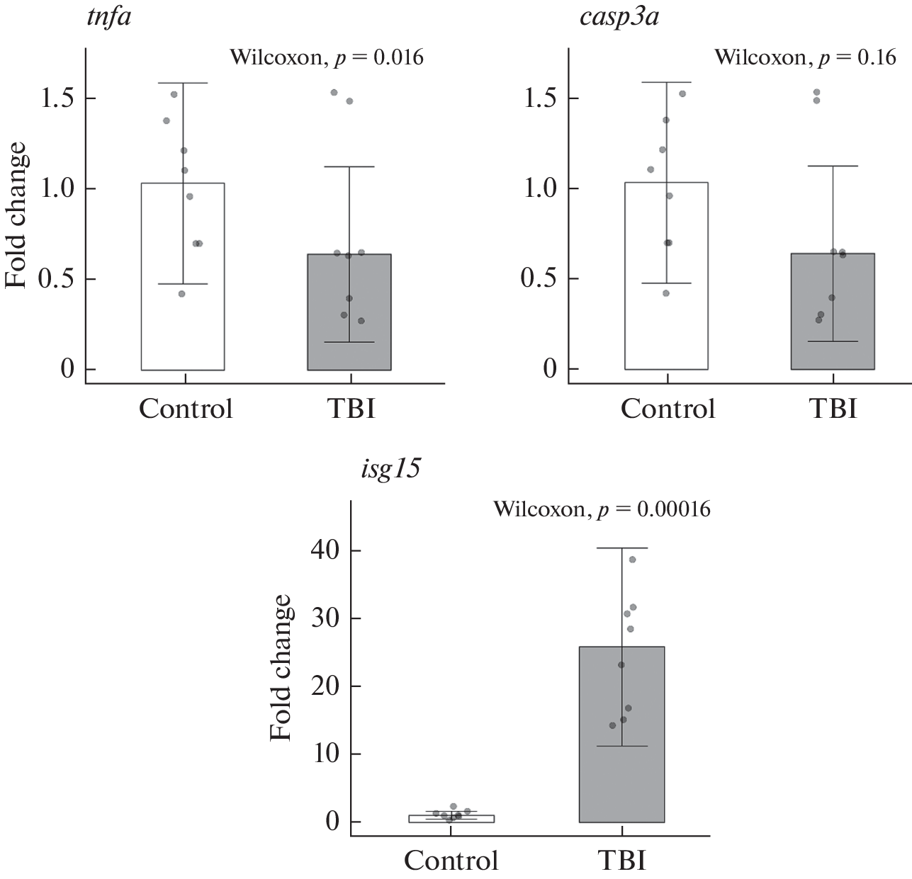 Traumatic brain injury (TBI) is a serious biomedical problem with high prevalence and mortality risks. Understanding TBI in traditional (e.g., rodent) animal models often presents challenges due to the complexity of their brain and its limited regenerative capabilities. Here, we present novel data obtained using the zebrafish TBI model based on a stab wound of telencephalon, aiming to investigate behavioral and molecular consequences of TBI in zebrafish. Four days following the injury, adult zebrafish displayed hypolocomotion in the novel seen tank test and impaired working memory in the Y-maze test, paralleling behavioral deficits in rodent models and human TBI patients. Molecular analyses of key genes involved in the inflammatory response and cell death pathways revealed a remarkable upregulation of the interferon-stimulated gene 15 (isg15) in the injured telencephalon, a general biomarker for neuronal damage. Furthermore, noradrenaline (but not dopamine or serotonin) levels in whole-brain tissue declined following TBI, likely contributing to the observed cognitive deficits and implicating neurotransmitter dysregulation in TBI pathogenesis.