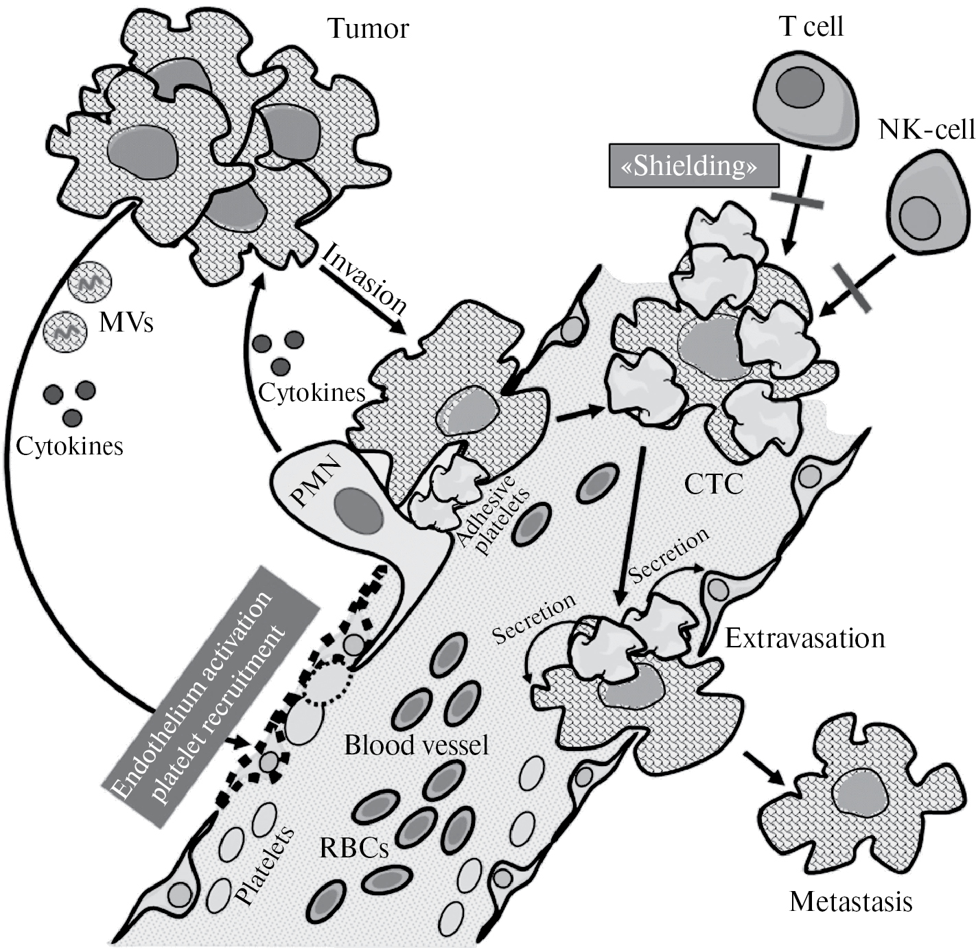 Участие тромбоцитов крови человека в процессе развития онкологических заболеваний было продемонстрировано еще в 1968 [26], и далее исследования велись по трем основным направлениям: 1) тромбоцитоз как признак развития опухоли и/или неблагоприятного прогноза [27]; 2) участие тромбоцитов в пролиферации опухолевых клеток и васкуляризации опухоли; 3) участие тромбоцитов в метастазировании опухоли и экстравазации циркулирующих опухолевых клеток [28, 29]. Можно заметить, что первое направление на самом деле является следствием либо второго, либо третьего и свидетельствует о важности тромбоцитов для прогресса онкологического процесса, при этом многие детали механизмов взаимодействия клеток опухолей и тромбоцитов до сих пор не уточнены.