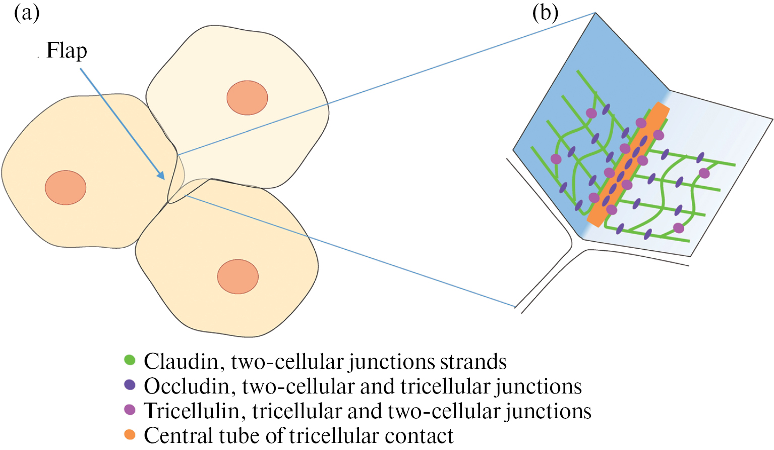 Рис. 2. Схематичное изображение места соединения трех клеток эндотелия (a) и трехклеточного плотного контакта, образованного в этом месте (b). Стрелкой отмечен лепесток клетки, настилающейся над двумя другими в месте трехклеточного контакта. Оранжевый цвет – центральная трубка трехклеточного плотного контакта. Зеленым цветом показаны фибриллы клаудина, образующие нити двухклеточных плотных контактов, подходящие к центральной трубке. Фиолетовый цвет – окклюдины, которые участвуют в формировании плотных контактов между двумя и тремя клетками. Розовый цвет – трицеллюлин, основной структурный белок трехклеточного плотного контакта, который, однако, также встречается и в двухклеточных контактах.