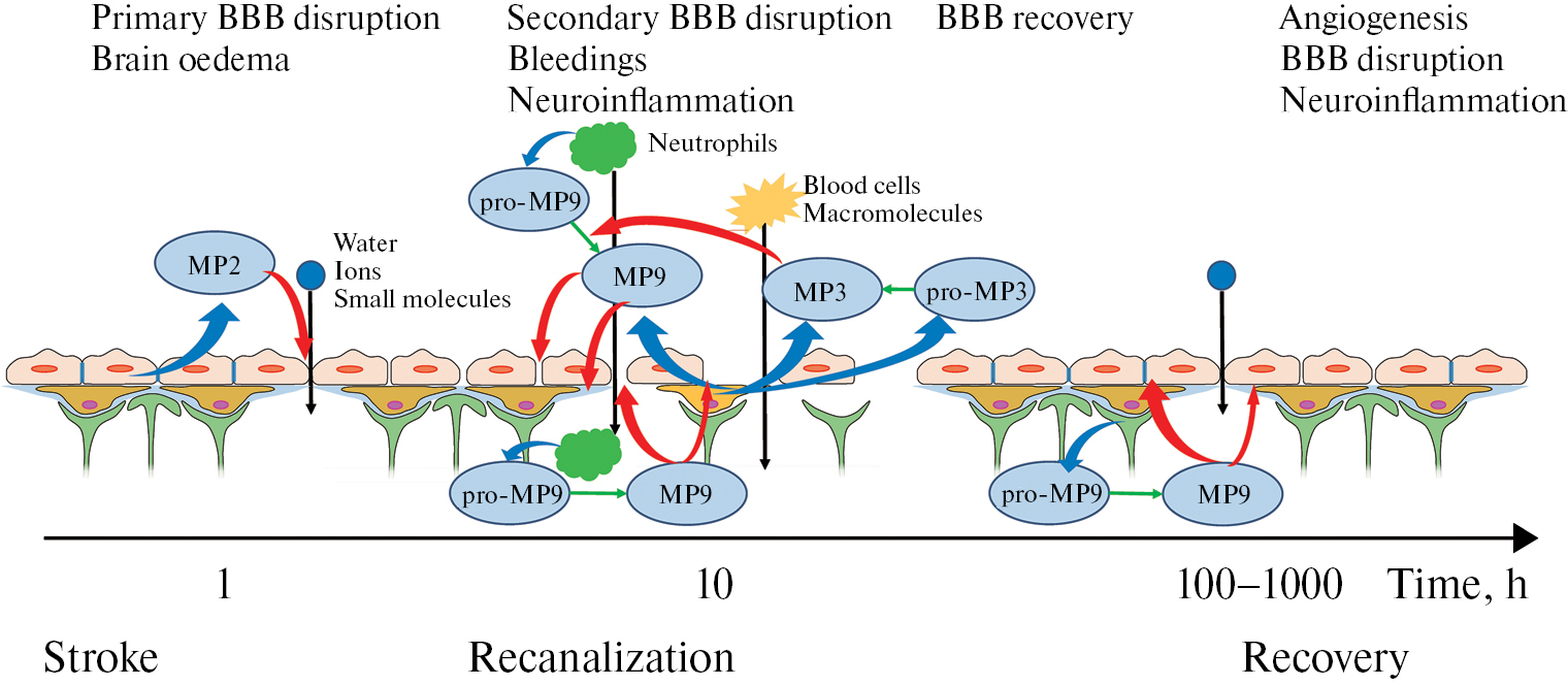 После ишемического повреждения головного мозга разрушение ГЭБ происходит достаточно быстро [89]. В течение 10 мин после реперфузии появляются признаки деградации базальной мембраны и разрушения ГЭБ [90, 91]. Первичные прорехи в ГЭБ были зарегистрированы в течение 2–6 ч (медиана 3.8 ч) от начала инсульта [92, 93]. Периоды повышенной проницаемости ГЭБ наблюдались через 4–8 ч и снова через 12–16 ч [94, 95] после начала инсульта. Эта эскалация проницаемости ГЭБ может быть связана с гиперемией и гипоперфузией, развивающимися при инфаркте [95]. Начиная с 24 ч, наблюдается стойкое нарушение ГЭБ, которое длится неделями. Наиболее изученными являются начальные моменты ишемии, процессы, происходящие в течение первых 24 ч с начала инсульта.