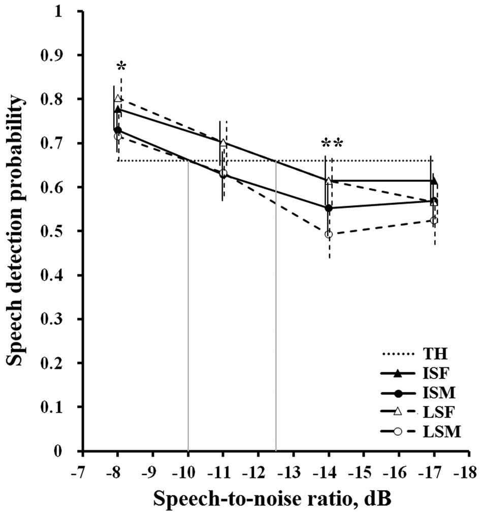 Рис. 3. Обнаружение мужского и женского голоса при обычной и ломбардной речи (источник удален на 1 м от слушателя) на фоне шума многоголосия (источник удален на 4 м от слушателя). По абсциссе – соотношение сигнал/шум (дБ); по ординате – вероятность обнаружения речевого стимула на фоне шума многоголосия; TH – порог обнаружения стимула; ISF – стимул с женской обычной речью; ISM – стимул с мужской обычной речью; LSF – стимул с женской ломбардной речью; LSM – стимул с мужской ломбардной речью. Маркерами показаны достоверные различия вероятности обнаружения женской и мужской ломбардной речи; * – p < 0.05, ** – p < 0.01 (биномиальный тест, n = 288). Вертикальные линии – доверительный интервал (n = 288).