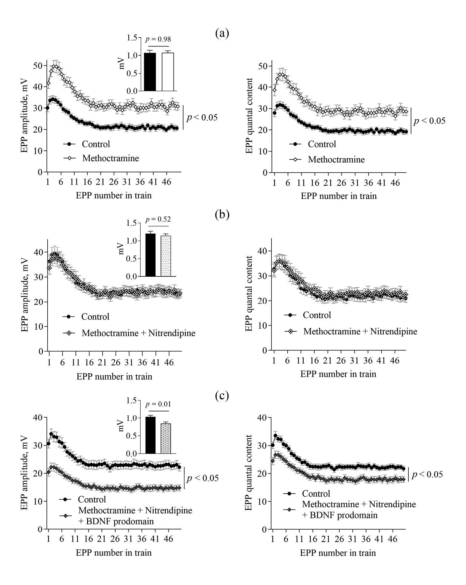 Учитывая, что метоктрамин-индуцированное и опосредованное активностью Са2+-каналов L-типа возрастание квантового состава ПКП в залпах могло замаскировать проявления негативного влияния на квантовую секрецию АХ продомена BDNF, в следующей серии экспериментов проводили одновременное двойное блокирование M2-холинорецепторов и Са2+-каналов L-типа. Оказалось, что в присутствии метоктрамина и нитрендипина продомен BDNF полностью сохранил способность угнетать квантовую секрецию АХ, снижая как амплитуду постсинаптических потенциалов, так и квантовый состав ПКП (рис. 3c).