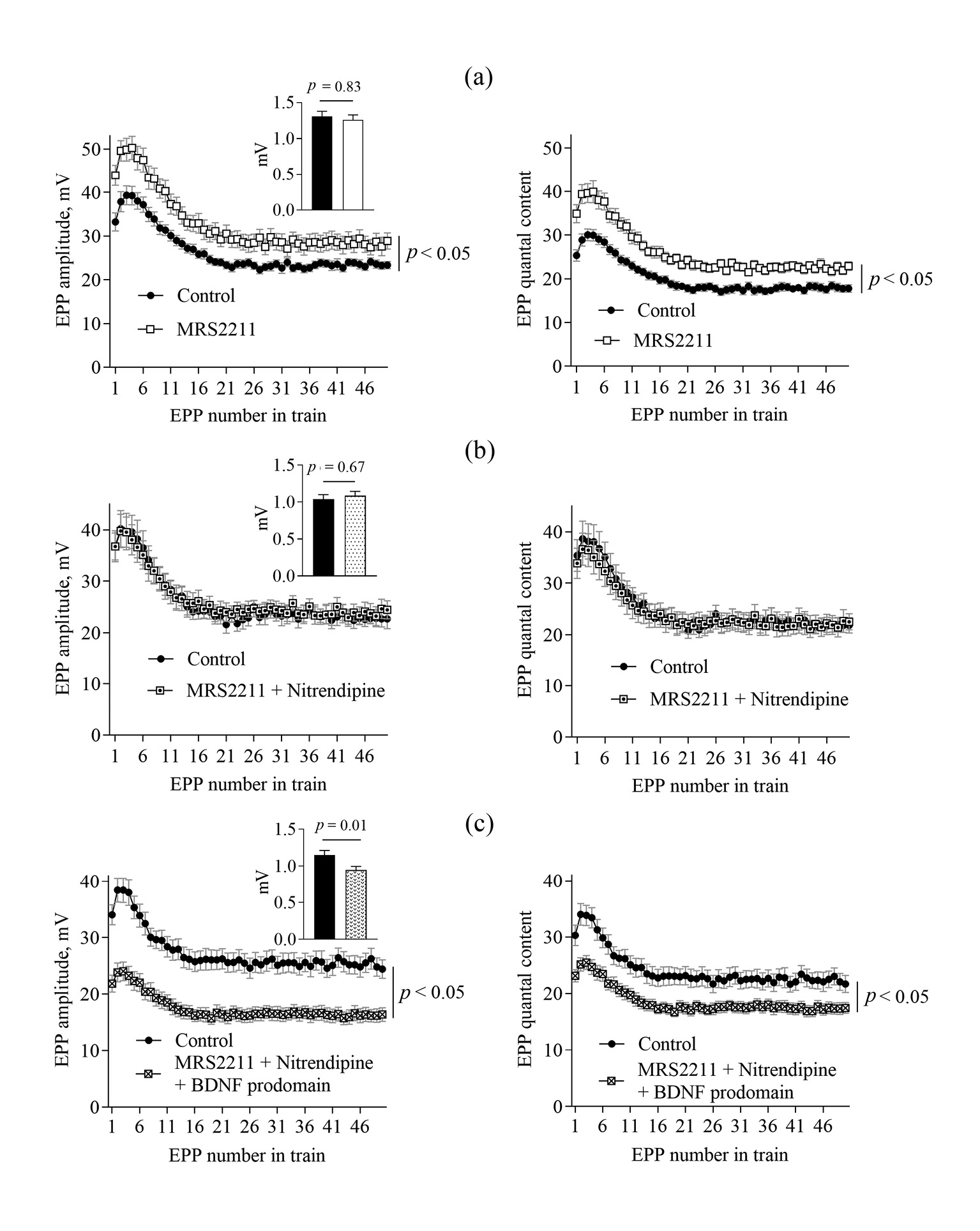 Ингибирование P2Y13-рецепторов MRS2211 (10 мкМ) оказывало на вызванную квантовую секрецию АХ в коротких ритмических залпах такой же эффект, как и ингибирование M2-холинорецепторов. Под действием MRS2211 происходило равномерное увеличение амплитуд ПКП по всему ходу коротких залпов за счет возрастания квантового состава ПКП (рис. 4a). Оказалось, что активность P2Y13-рецепторов, как и M2-холинорецепторов, направлена на предотвращение вовлечения в регуляцию квантовой секреции АХ Ca2+-каналов L-типа – потенцирующее действие MRS2211 предотвращалось нитрендипином (рис. 4b). Однако, как и в случае с M2-холинорецепторами, продомен BDNF при ингибировании P2Y13-рецепторов MRS2211 и заблокированных нитрендипином Ca2+-каналах L-типа эффективно проявлял свое тормозное влияние на квантовую секрецию АХ. В этих условиях происходило снижение как амплитуд постсинаптических потенциалов, так и квантового состава ПКП в залпах (рис. 4c). Полученные данные являются сильным аргументом в пользу того, что, несмотря на присутствие и активность P2Y13-рецепторов в моторных синапсах мыши [12, 35], доказанную физиологическую значимость этих рецепторов как негативных регуляторов выброса АХ [13, 36], их модулирующая активность не сопряжена со специфическим комплексным торможением секреции АХ под влиянием продомена BDNF.