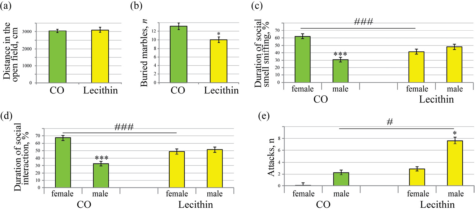 Рис. 2. Поведенческие характеристики мышей после длительного приема лецитина. (a) – общий пройденный путь в открытом поле в тесте Открытое поле; (b) – снижение числа закопанных шариков в тесте закапывания шариков; (c) – нарушение предпочтения в тесте на предпочтение социальных запахов; (d) – нарушения социального и полового предпочтения в тесте с двумя интрудерами; (e) – повышение агрессии по отношению к самцам-интрудерам. CO – контрольные животные C57BL/6J, Lecithin – животные, длительно принимавшие соевый лецитин. Данные представлены как среднее значение ± стандартная ошибка среднего, n = 10 для каждой группы, * – p < 0.05, ** – p < 0.01, *** – p < 0.001.
