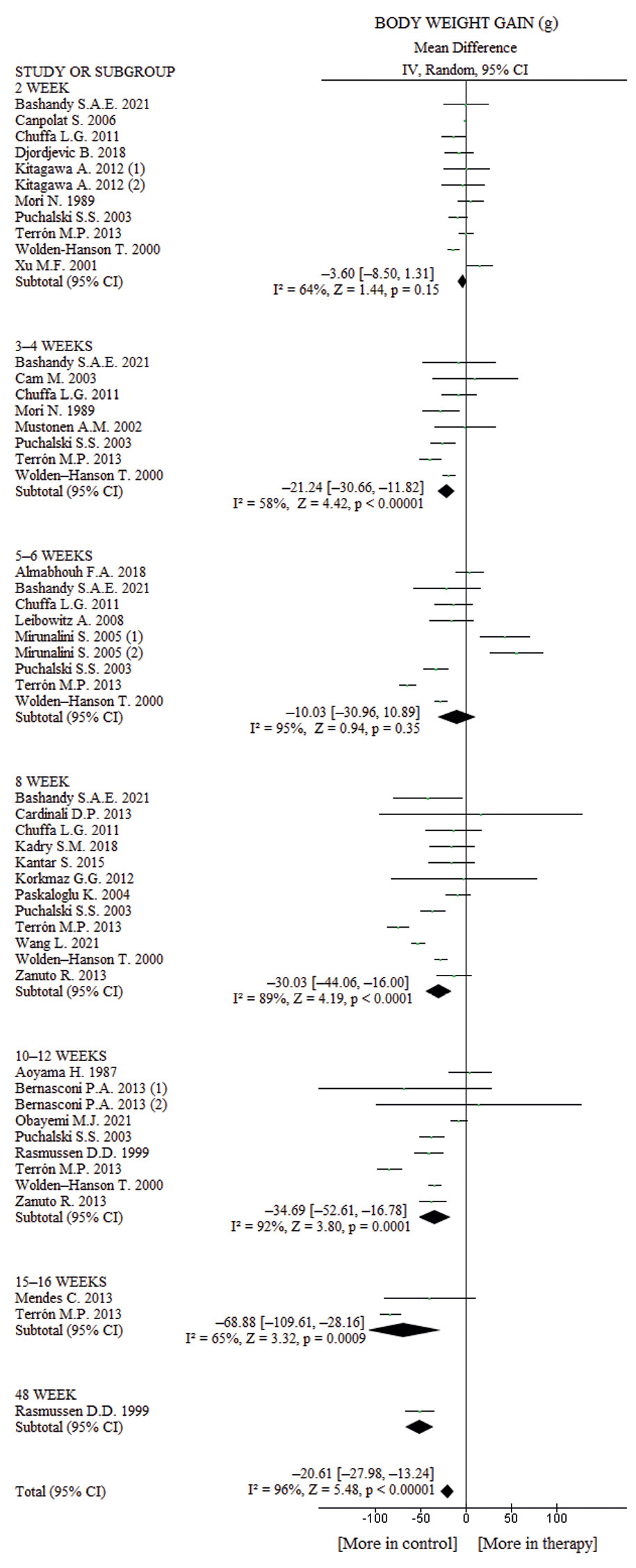 Из отобранных работ мы извлекали данные по массе тела крыс (в граммах) в начале и конце/на этапе терапии, затем рассчитывали в граммах ПМТ (как разницу между массой тела в конце/на этапе терапии и массой тела перед началом терапии). Кроме того, были извлечены данные по количеству потребляемой пищи (в г/день) и количеству потребляемой воды (в мл/день) в контрольной группе и в группе животных, которые принимали мелатонин. Также были извлечены данные по уровню лептина, адипонектина и грелина. Если данные были представлены отдельно для самцов и самок, то мы рассчитывали среднее арифметическое.
