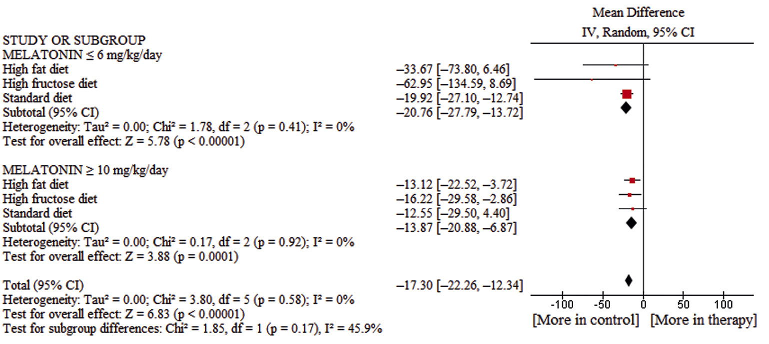 При проведении метаанализа мы отдельно исследовали крыс на стандартной диете, на диете с повышенным содержанием фруктозы, на диете с повышенным содержанием жиров и на диете, обогащенной холестерином. Далее мы объединяли данные в субгруппы по времени терапии мелатонином. При достаточном количестве исследований был проведен анализ зависимости эффекта от дозы и способа введения мелатонина.