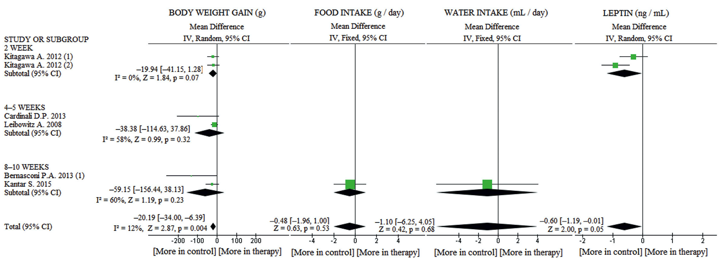 Рис. 4. Влияние терапии мелатонином на прирост массы тела, потребление корма и воды, уровень лептина у крыс, содержащихся на высокофруктозной диете. Метаанализ сделан без дополнительной стандартизации по дозе, способу и времени введения мелатонина.