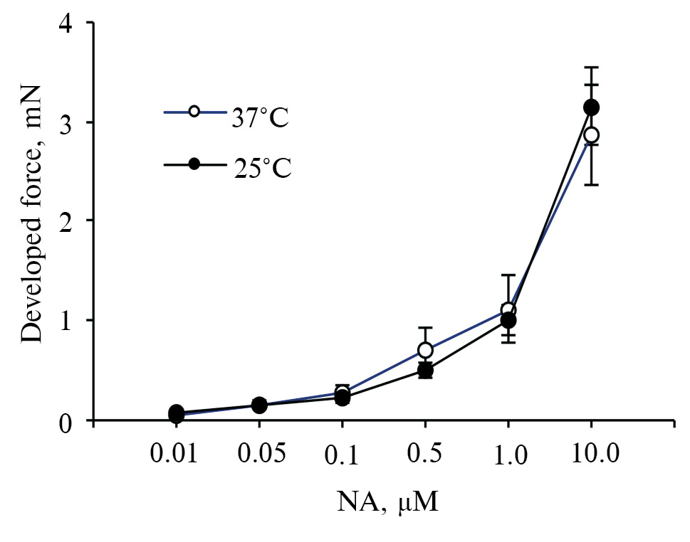 Было обнаружено, что охлаждение не изменяет сократительную реакцию на норадреналин при всех использованных нами концентрациях (рис. 1). В частности, реакция на норадреналин, наблюдавшаяся при его максимальной концентрации 10.0 мкМ, составляла при температуре 37°С и 25°С 2.9 ± 0.5 и 3.1 ± 0.4 мН (р > 0.05) соответственно.