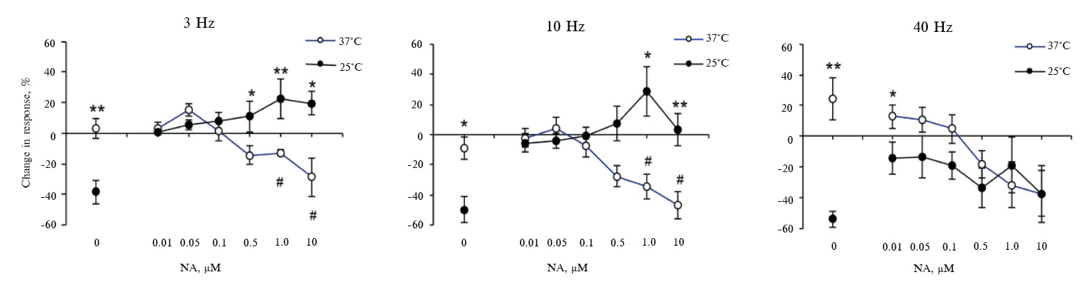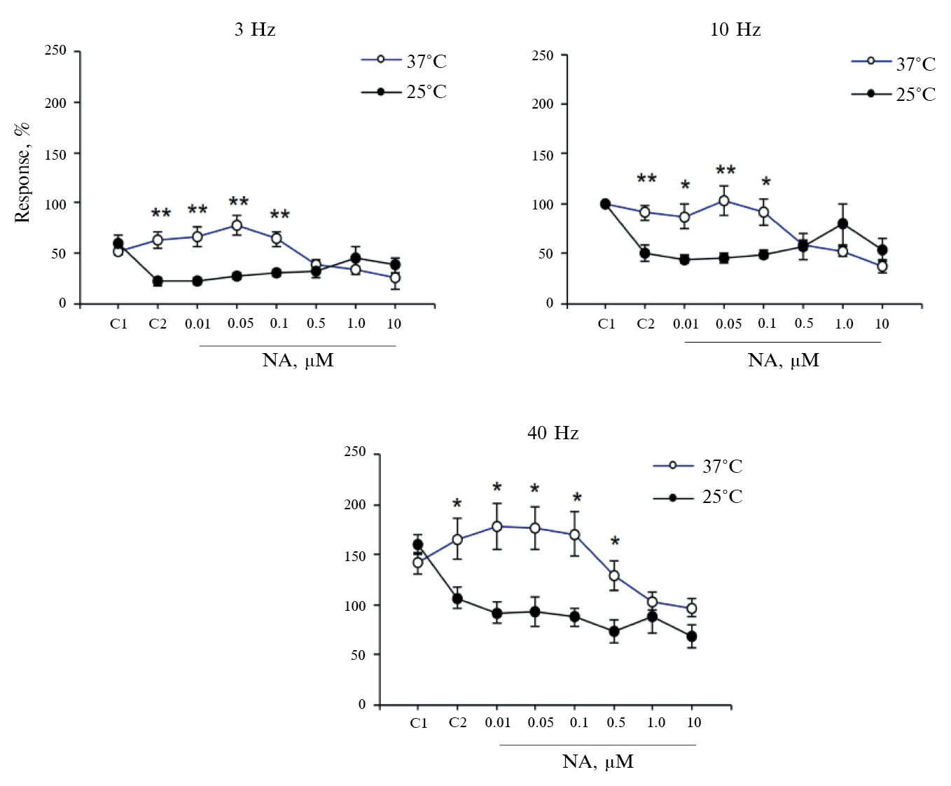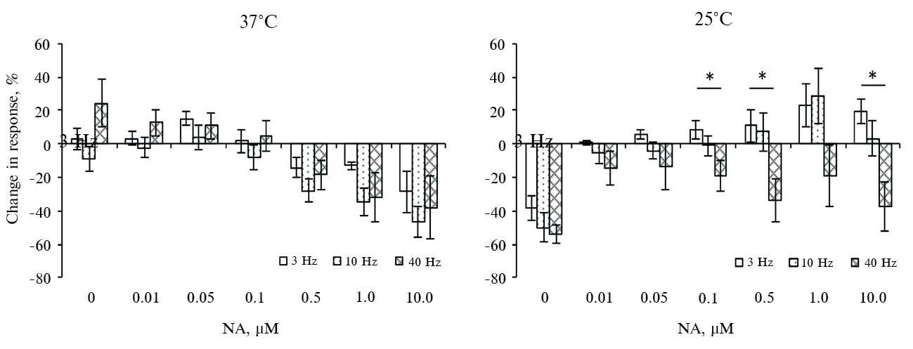 Для выяснения вопроса о зависимости действия норадреналина на нейрогенный ответ от частоты ЭС данные, представленные на рис. 4, были перегруппированы и построены графики (рис. 5), которые наглядно показывают, что в условиях нормальной температуры действие норадреналина на нейрогенную сократительную реакцию брыжеечной артерии крысы не зависит от частоты ЭС, в то время как в условиях низкой температуры при минимальной частоте ЭС норадреналин в диапазоне концентраций 0.1–10.0 мкМ увеличивает нейрогенный ответ, а при максимальной – его уменьшает, и эта разница является статистически значимой.