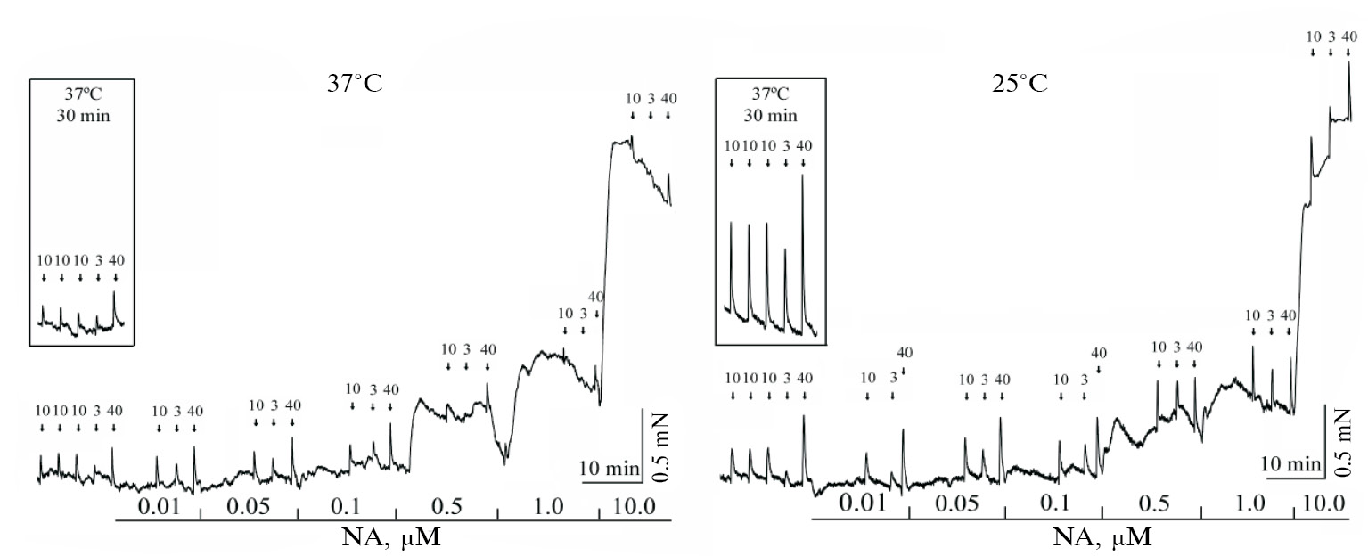 Рис. 3. Оригинальная запись изменения напряжения сегмента верхней брыжеечной артерии в ответ на электростимуляцию (отмечена стрелками) с частотой 3, 10 и 40 Гц до, а также на фоне действия норадреналина (NA) при температуре 37°С и 25°С. На врезках показана величина реакции на электростимуляцию при температуре 37°С через 30 мин после растяжения сегмента.