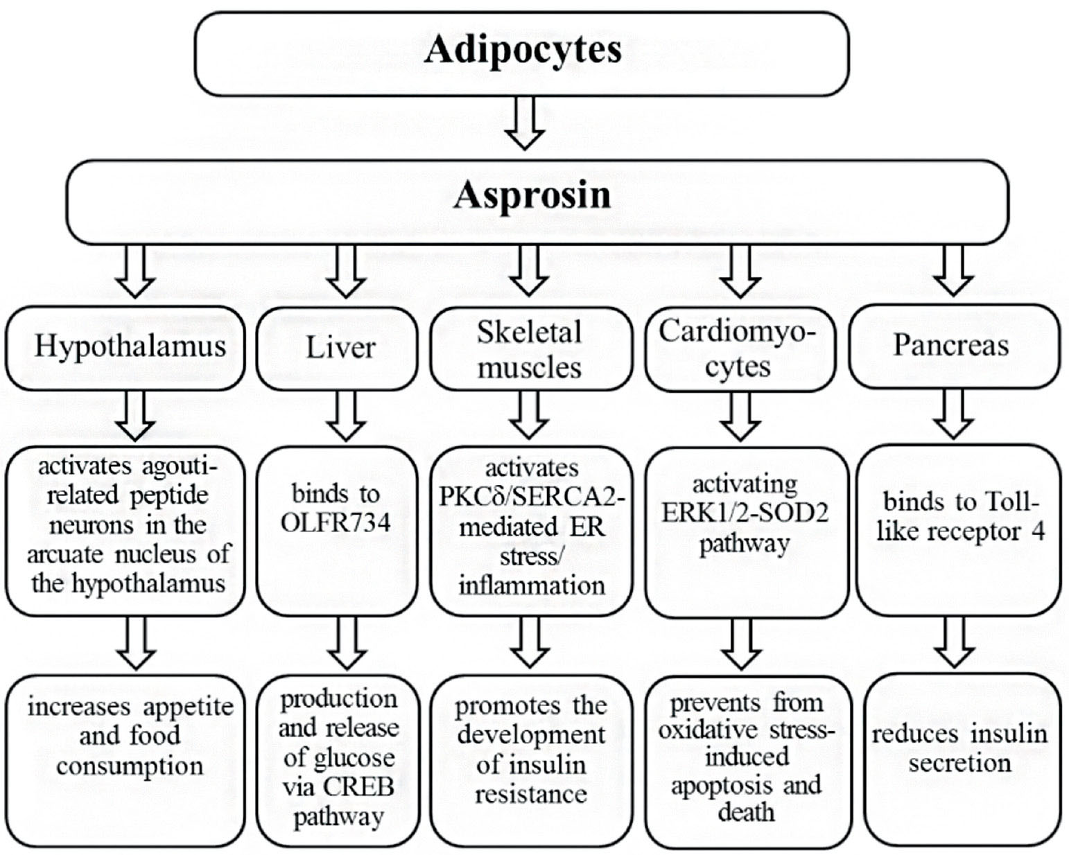 - Shabir K, Brown JE, Afzal I, Gharanei S, Weickert MO, Barber TM, Kyrou I, Randeva HS (2021) Asprosin, a novel pleiotropic adipokine implicated in fasting and obesity-related cardio-metabolic disease: Comprehensive review of preclinical and clinical evidence. Cytokine Growth Factor Rev 60: 120–132. https://doi.org/10.1016/j.cytogfr.2021.05.002