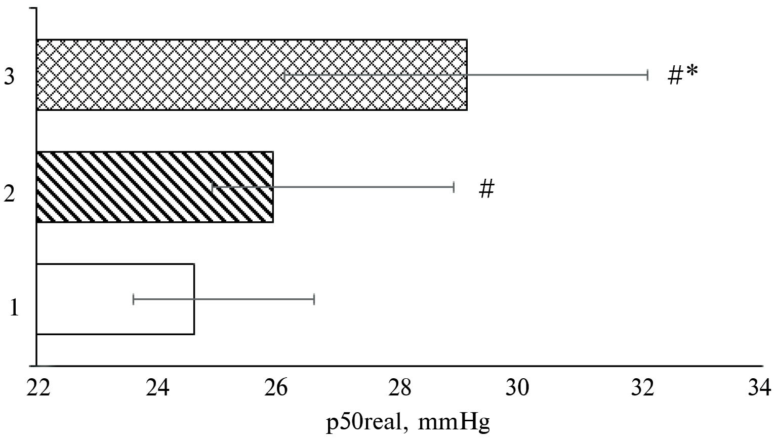 Рис. 3. Значение показателя сродства гемоглобина к кислороду р50 у здоровых лиц с нормальной массой тела (1), с избыточной массой тела (2) и с ожирением I степени (3). Изменения статистически значимы по отношению к лицам с нормальной массой тела – #, с избыточной массой тела – *.