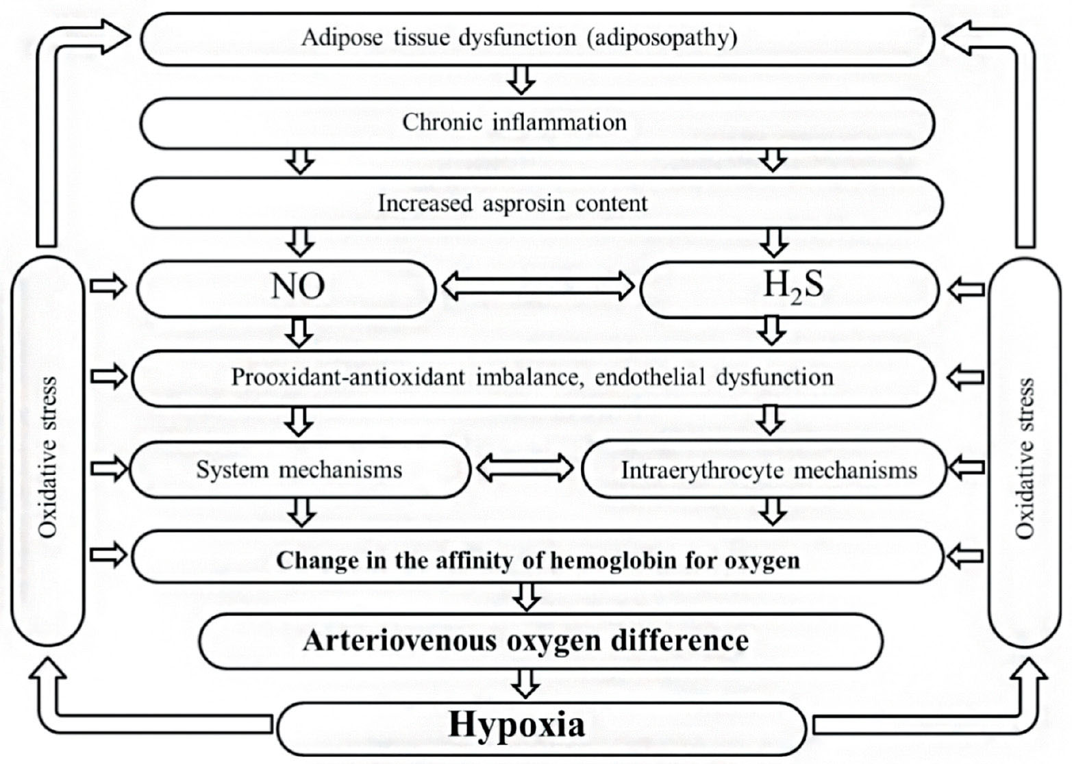 При ожирении характерна, как ни парадоксально, гипероксия жировой ткани даже при наличии снижения кровотока в ней, что может быть объяснено уменьшением потребления кислорода развитием воспаления, в результате чего развивается местный ответ, который в макрофагах и адипоцитах может быть причиной хронического воспаления [9]. Физиологические уровни газотрансмиттера NO играют ключевую роль в поддержании метаболической функции жировой ткани [29]. Адипокины, передающие сигнал к мишеням (сосуды, мозг, печень, мышцы), сопряжены с L-аргинин-NO-зависимым сигнальным каскадом, влияющим на патогенез метаболических нарушений [53].