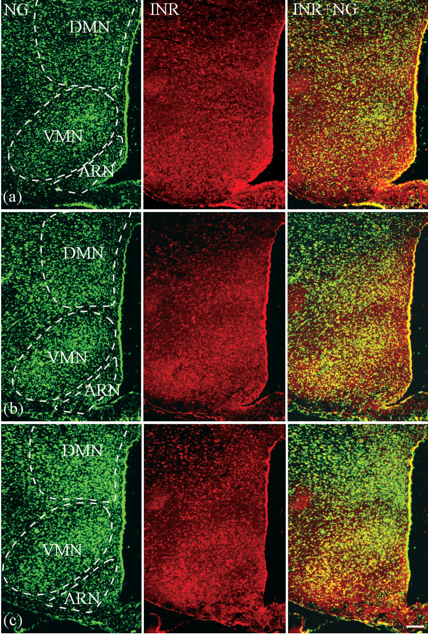 Рис. 1. Микрофотографии с двойным мечением: окраска NeuroTrace Green (NG, зеленый, левый ряд), INR (красный, средний ряд), комбинированное фото INR+NG (правый ряд) нейронов 2- (a), 12- (b) и 24-месячных (c) крыс. ARN – аркуатное, DMN – дорсомедиальное и VMN – вентромедиальное ядро. Флуоресценция Сy3 (красный), NeuroTrace Green (зеленый). Масштаб – 300 мкм.