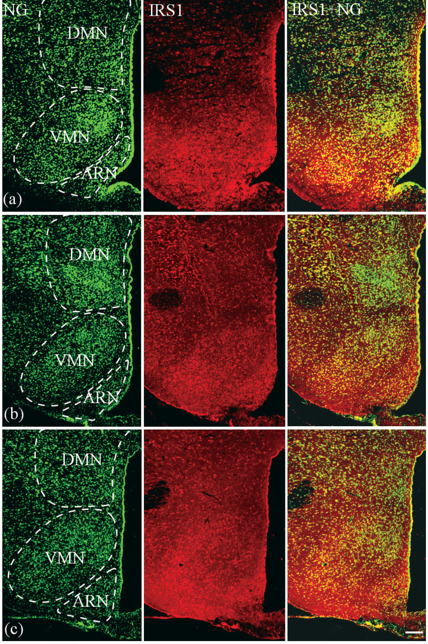 Рис. 2. Микрофотографии с двойным мечением: окраска NeuroTrace Green (NG, зеленый, левый ряд), IRS1 (красный, средний ряд), комбинированное фото IRS1+NG (правый ряд) нейронов 2- (a), 12- (b) и 24-месячных (c) крыс. ARN – аркуатное, DMN – дорсомедиальное и VMN – вентромедиальное ядро. Флуоресценция Сy3 (красный), NeuroTrace Green (зеленый). Масштаб – 300 мкм.
