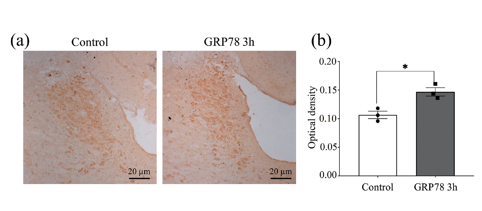 Рис. 2. Экзогенный GRP78, введенный интраназально, накапливается в нейронах голубого пятна у крыс в контрольных условиях. (a) – репрезентативные микрофотографии голубого пятна. (b) – оптическая плотность нейронов голубого пятна. Данные представлены как среднее ± ошибка среднего. Control – контрольные животные, получавшие растворитель GRP78, стерильный апирогенный фосфатный буфер рН 7.4 (PBS) (n = 3); Grp78 – животные, получавшие GRP78 интраназально (n = 3). Различия между группами в соответствии c t-критерием Стьюдента и указаны как * p ≤ 0.05 по сравнению с группой контроля.