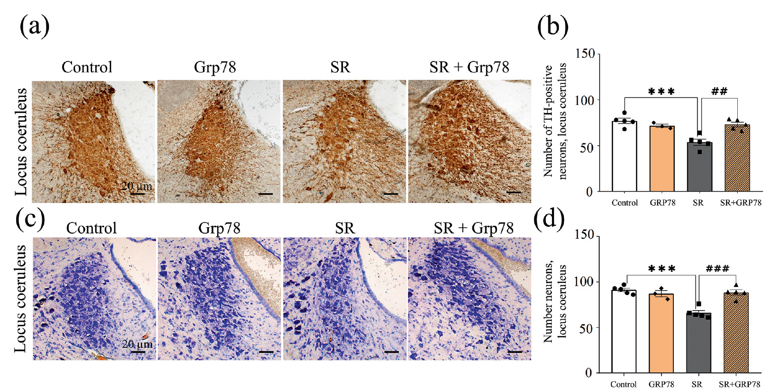 Рис. 3. Интраназальное введение экзогенного GRP78 препятствует дегенерации норадренергических нейронов голубого пятна в модели хронического ограничения сна. (a, c) – репрезентативные микрофотографии голубого пятна, (b) – количество ТГ-позитивных нейронов в голубом пятне, (d) – количество нейронов, окрашенных по методу Ниссля в голубом пятне. Данные представлены как среднее ± ошибка среднего. Control – контрольные животные (n = 5), (Grp78) – введение Grp78 в контрольных условиях (n = 3), Sleep restriction (SR) – ограничение сна в течение 5 дней (n = 5), SR+Grp78 – введение Grp78 в модели хронического ограничения сна (n = 5). Различия между группами в соответствии однофакторным дисперсионным анализом ANOVA с последующим Тьюки post-hoc указаны как: *** p < 0.001 по сравнению с группой контроля; ## p < 0.01, ### p < 0.001 по сравнению с эффектом ограничения сна.