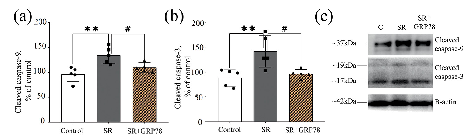 Рис. 4. Интраназальное введение экзогенного GRP78 предотвращает развитие апоптоза в модели хронического ограничения сна. (a) – содержание расщепленной каспазы-9, (b) – содержание расщепленной каспазы-3, (c) – репрезентативные иммуноблоты. Данные представлены как среднее ± ошибка среднего. Control – контрольные животные (n = 5), SR – sleep restriction, ограничение сна в течение 5 дней (n = 5), SR+Grp78 – введение Grp78 в модели хронического ограничения сна (n = 5). Различия между группами в соответствии однофакторным дисперсионным анализом ANOVA с последующим Тьюки post-hoc указаны как: ** p < 0.01 по сравнению с группой контроля; # p < 0.05 по сравнению с эффектом ограничения сна.