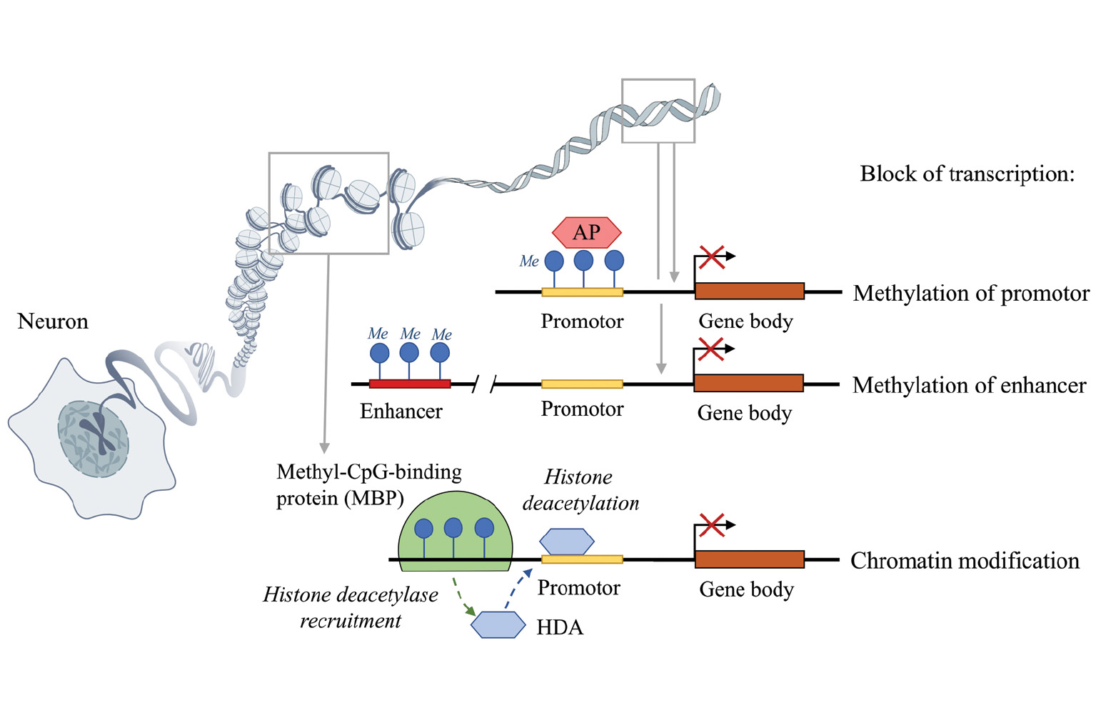 Накапливаются данные и о важной роли метилирования ДНК в реализации функций мозга. Например, у пациентов с болезнью Паркинсона отмечается изменение метилирования ДНК нейронов черной субстанции в ходе развития депрессивных симптомов [28]. С другой стороны, показана корреляция улучшения ряда когнитивных навыков человека при медитации и метилировании ДНК. В частности, отмечено изменение метилирования генов SLC1A2 (переносчика возбуждающих аминокислот EAAT2, основного транспортера глутамата), FBXO38 (регулятора убиквитинирования и противоопухолевой активности), HMP19 (супрессора рака поджелудочной железы), PPP1R9A (белка NRB1, который играет ключевую роль в формировании синапсов) и ряда других генов, кодирующих различные по функциям белки в мозге [29].