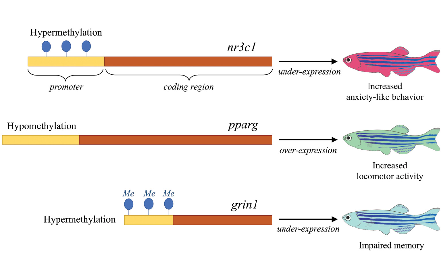 Гиперметилирование промотера гена глюкокортикоидного рецептора nr3c1 изменяет его экспрессию и, как следствие, нормальное функционирование гипоталамо-гипофизарно-надпочечниковой оси, усиливая тревожно-подобное поведение рыб [58]. Недостаток метилирования промотера гена гамма-рецептора, активируемого пролифератором пероксисом (pparg), ключевого транскрипционного фактора, который контролирует экспрессию многих нижестоящих генов, участвующих в процессах липидного транспорта, биогенеза и липолиза, приводит к увеличению экспрессии pparg. В свою очередь, это вызывает быстрое накопление АТФ и аномальное повышение локомоторной активности мальков зебраданио [59]. В механизме патогенеза нарушения памяти важную роль играет глутаматный ионотропный рецептор и его субъединица 1 (grin1), промотор гена которой под воздействием никотина гиперметилируется у рыб (и у крыс), что приводит к подавлению экспрессии контролируемого им гена и ухудшению памяти зебраданио [60].