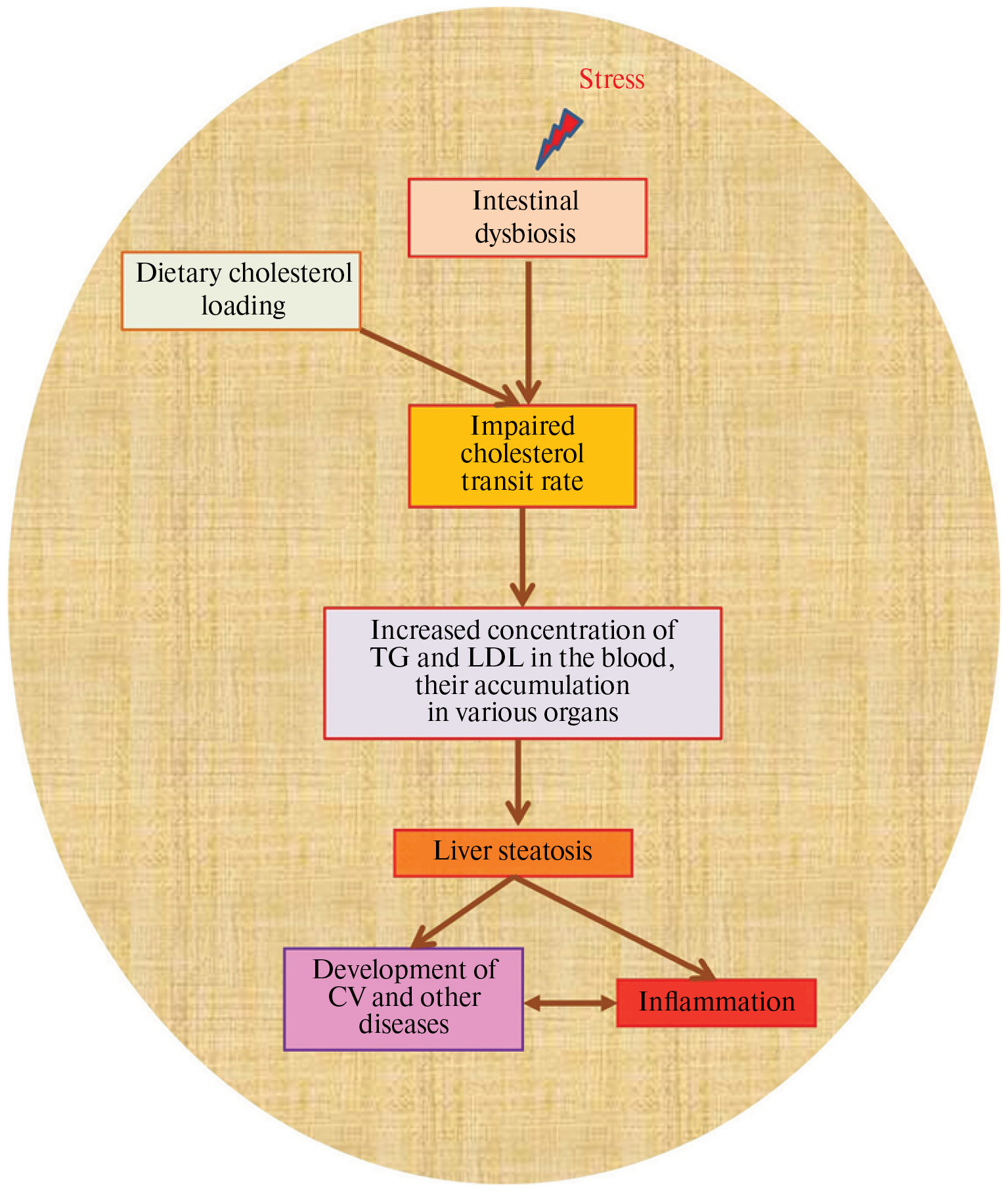 Рис. 3. Путь развития заболеваний печени и других заболеваний при гиперхолестеринемии. TG – триглицериды, LDL – липопротеины низкой плотности, CV – сердечно-сосудистые заболевания.