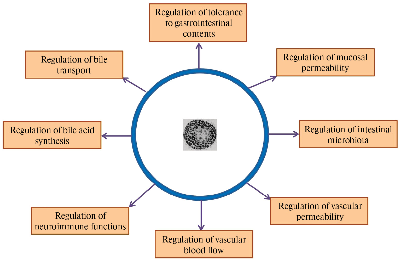 В современных работах показано, что печень взаимодействует с кишечником и компонентами кишечного барьера, в состав которого входит множество тучных клеток, через посредство желчных кислот, микробиоты кишечника и, конечно, нервной системы [8, 31, 32]. Снижение выработки желчных кислот печенью индуцирует дисбактериоз, в результате чего условно-патогенные бактерии и их липополисахариды (ЛПС) проникают в печень через воротную вену, вызывая активацию тучных клеток, секретирующих медиаторы воспаления. В то же время избыток желчных кислот обусловливает гибель гепатоцитов и приводит к тому же воспалительному эффекту [31, 32].